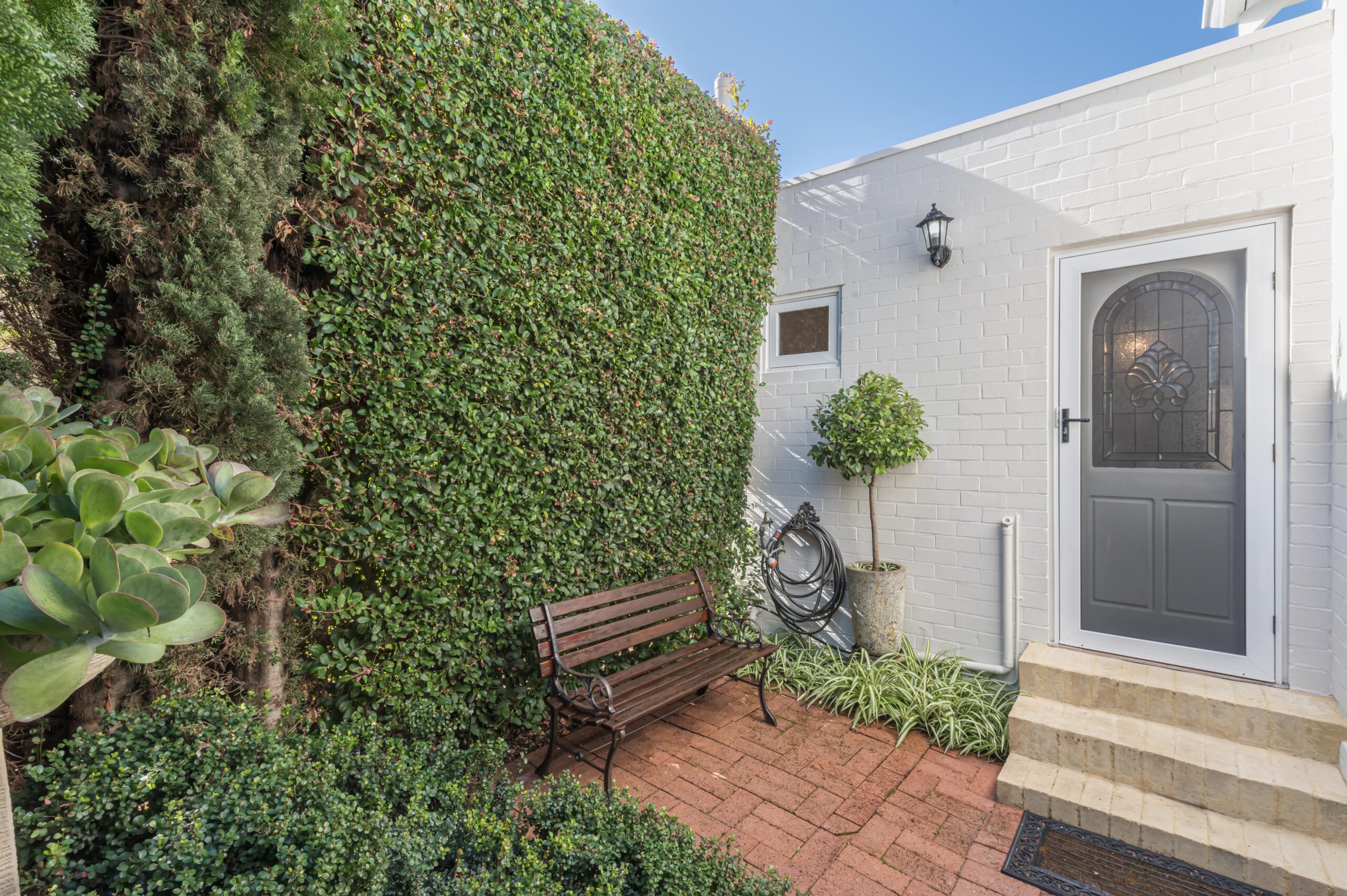 Welcoming Old English gardens, entry at the rear of the property