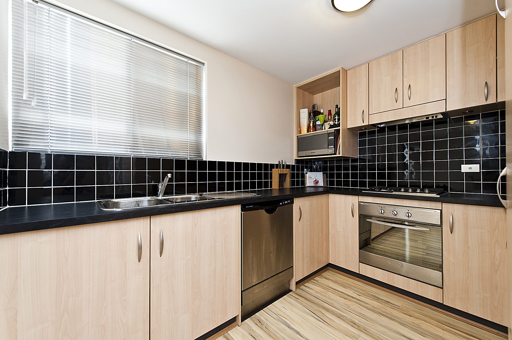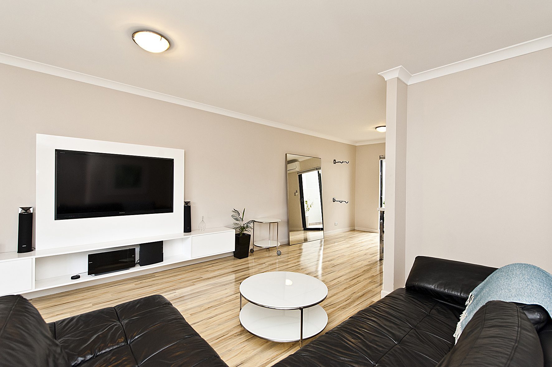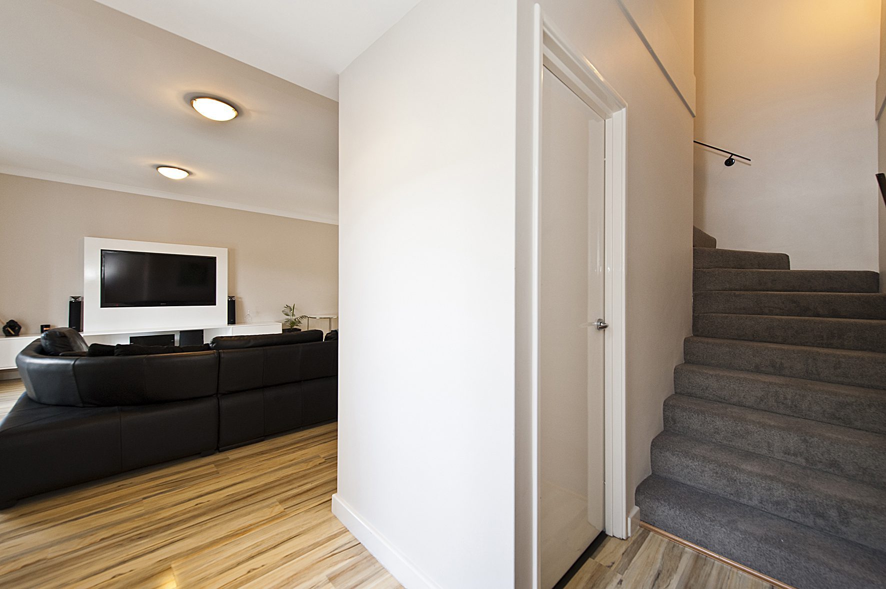 The interior of the property has a modern finish and is spread over 2 levels. The lower level features an excellent open plan living, dining and kitchen area (the white laminate entertainment unit with TV will be included in the sale). The kitchen features gas cooking, dishwasher and plenty of cupboard space.