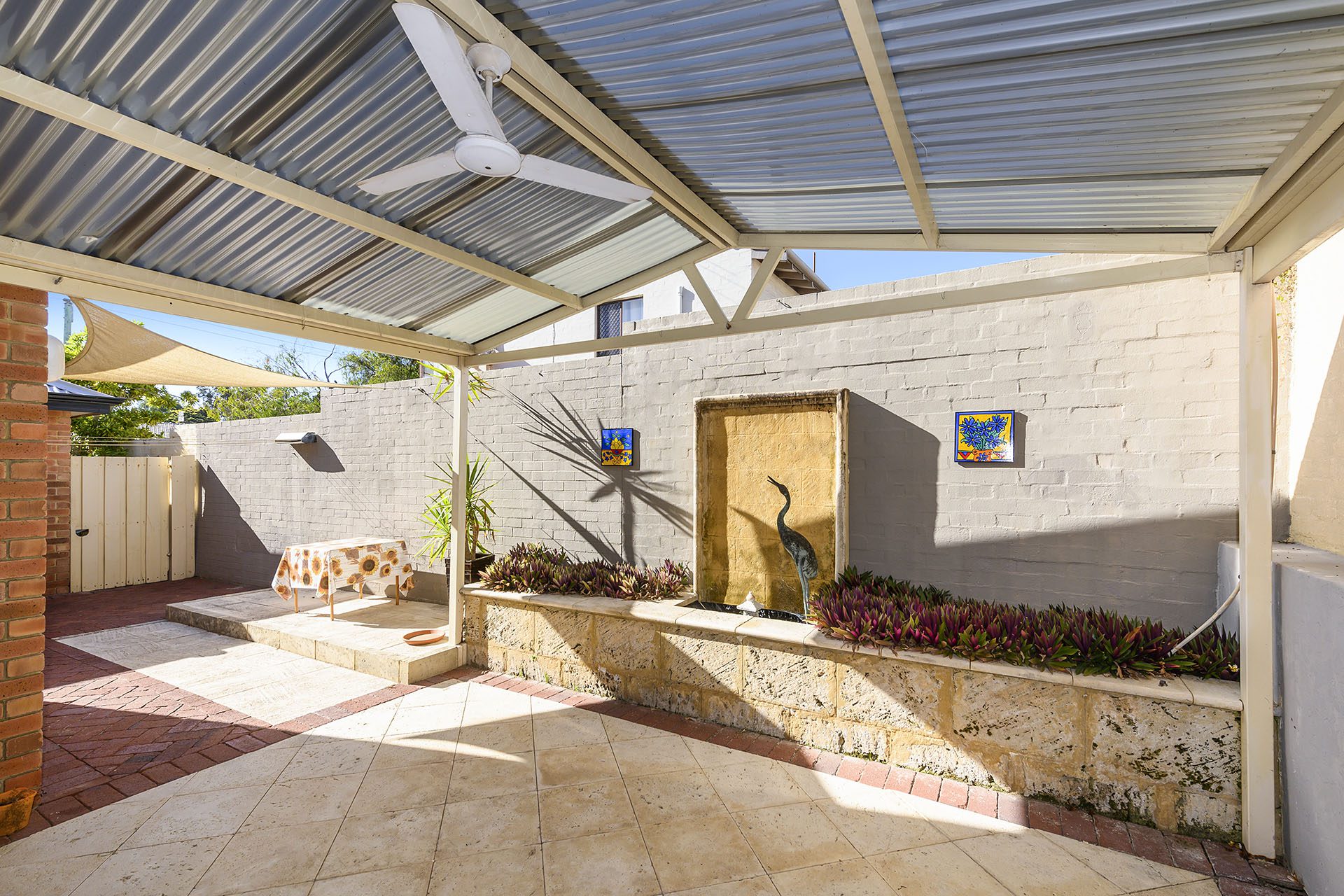 Making your way through the living room is the expanse of the well lit kitchen with loads of cupboards and bench space, which overlooks the dining/informal living room. With bifold doors which open to the limestone paved covered patio where you will also find a limestone garden bed and water feature. Tucked away next to the kitchen is the laundry which has access to the outdoor washing line.