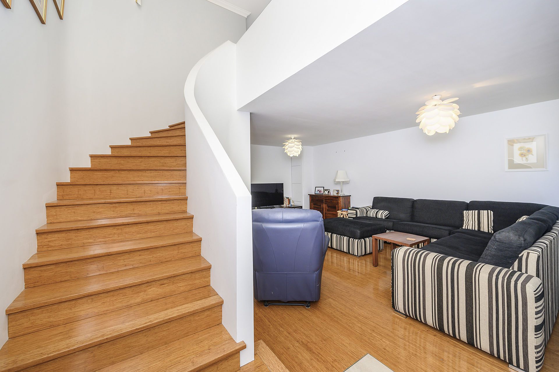 As you enter through the secure gates into the home is the curved staircase which lead up to the bedrooms. To the right of the staircase is the large living room and to the left is the powder room.