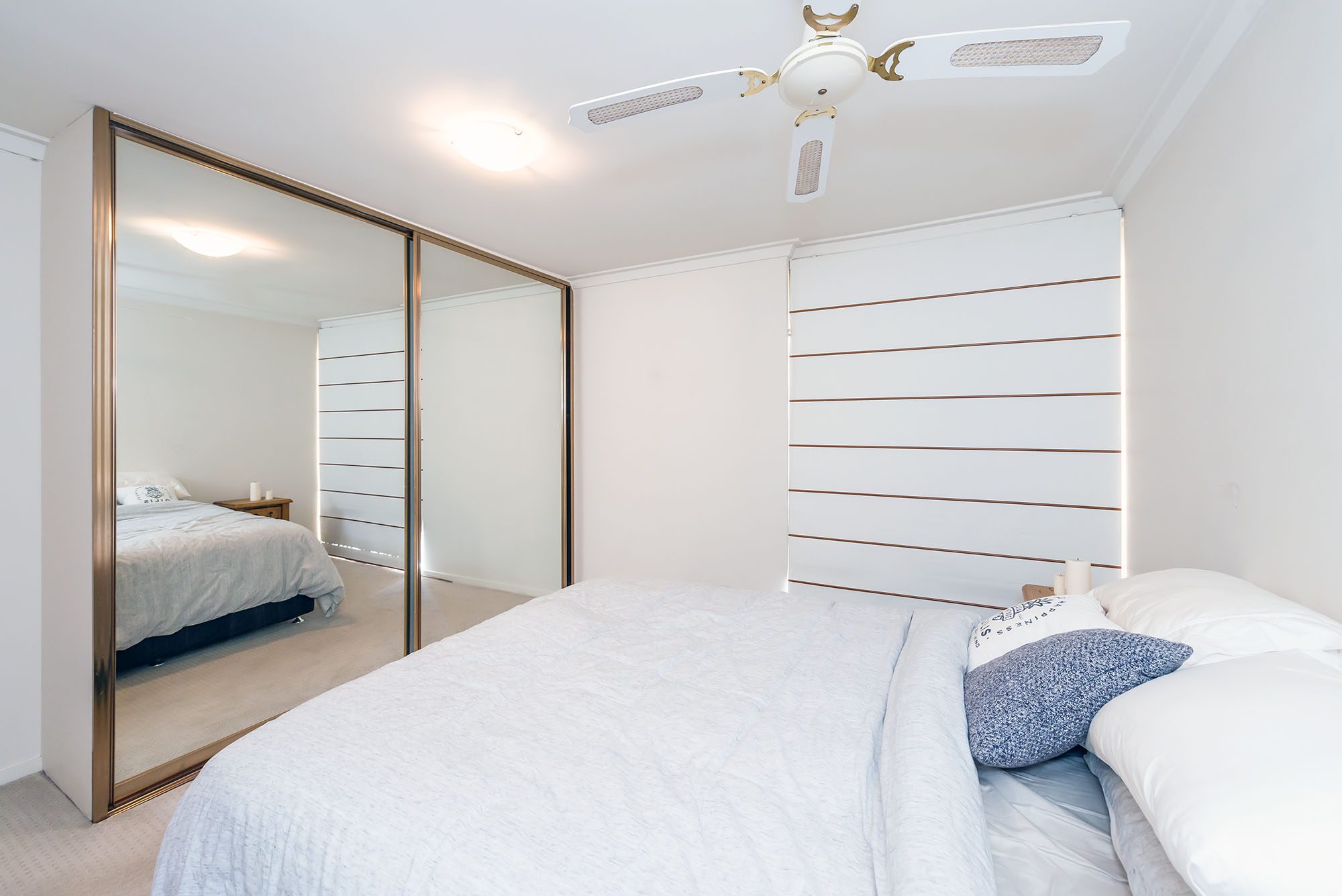– Bedroom with ceiling fan and mirrored built in robes