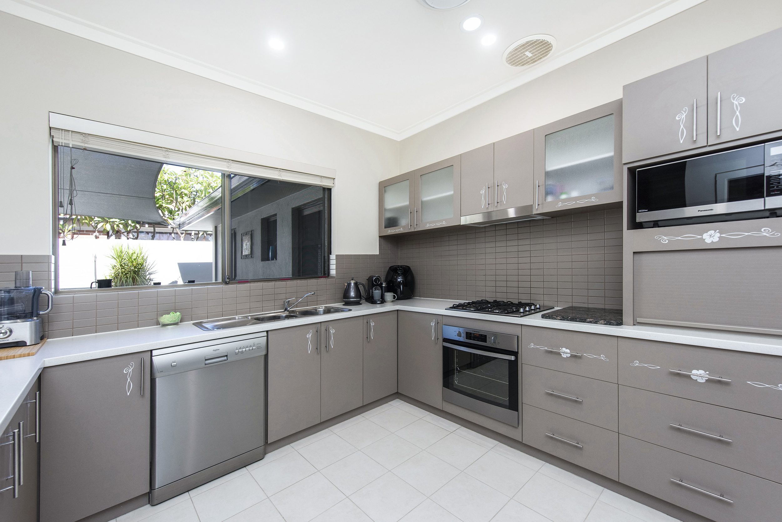 The large kitchen with plenty of bench space and breakfast bar overlooks the dining room.