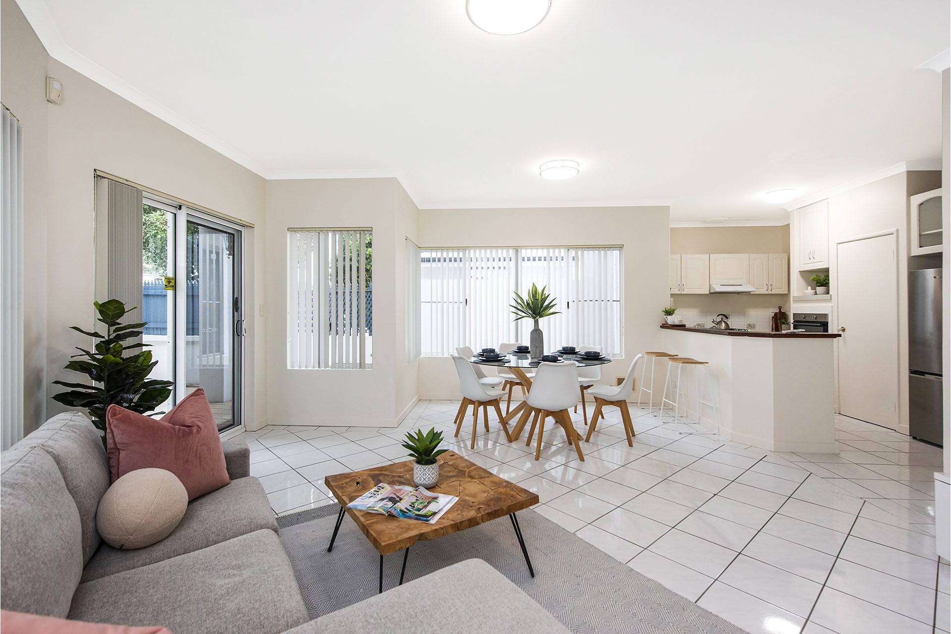 Upon entry you are greeted with the open plan living, dining and kitchen areas with white polished tiles under foot and an expanse of windows which allows for an abundance of natural light to pour into these areas. The living and dining area lead out to the paved front courtyard which is a good size, perfect for entertaining.