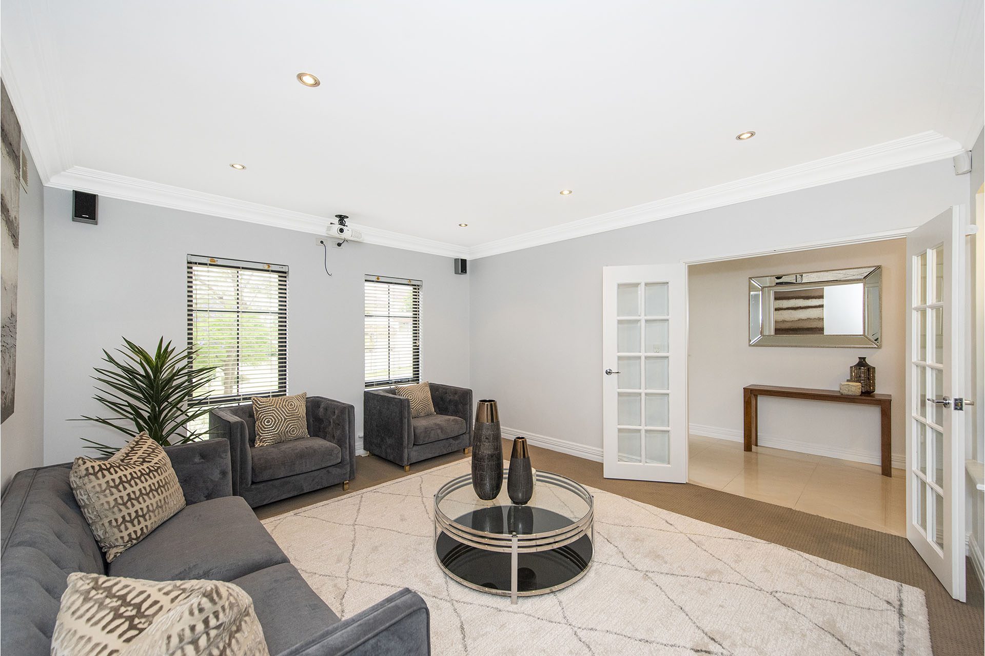 The home boasts 4 bedrooms, 2 bathrooms and powder room. Upon entry there is an ornate chandelier hanging above. Polished porcelain tiles underfoot lead to the kitchen, dining and family area. A formal lounge / theatre room is located at the front of the house.