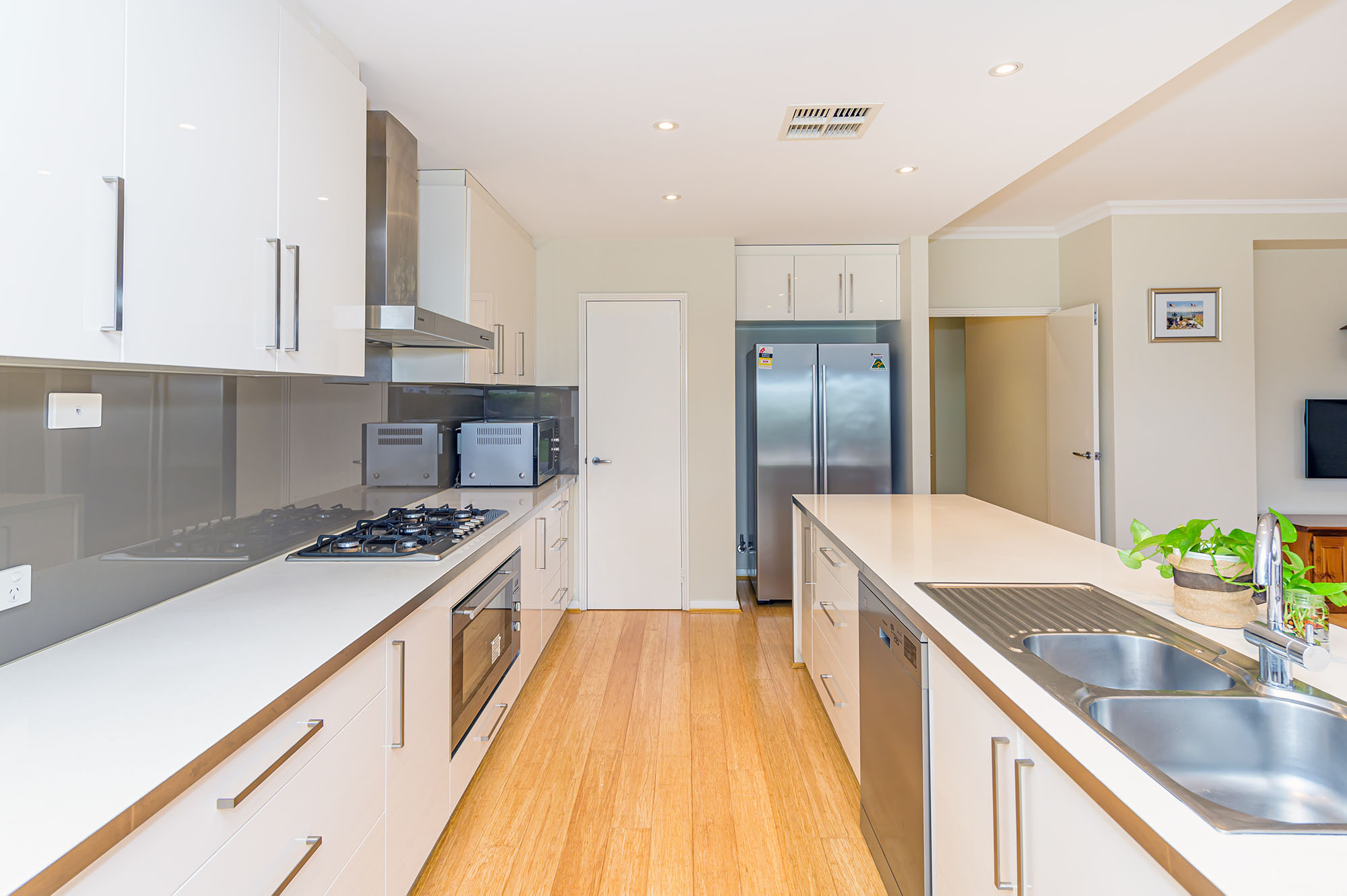 The design has been well thought out with a second master /guest bedroom with built in robes and ensuite on the ground. Also on this level a home theatre, study, powder room, laundry and open plan chefs kitchen adjoining the dining and living rooms that lead out to a spacious alfresco area with a cedar lined ceiling and pull down all weather blinds. The kitchen is a haven for relaxed entertaining having Caesarstone bench tops with plenty of bench space, breakfast bar and glass splashback.