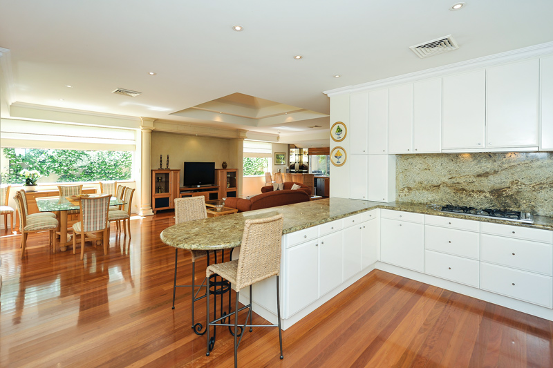 From the formal entry you are greeted by the beautiful timber floor boards leading you into the heart of the home. A sophisticated granite kitchen combines the functionality of breakfast bar seating, ample storage and a large walk in pantry with stylish European appliances. The adjacent open plan living and dining combine to create a relaxed family area whilst retaining a sense of space. French doors lead to an attractive alfresco entertaining area overlooking the rear garden and waterfall.