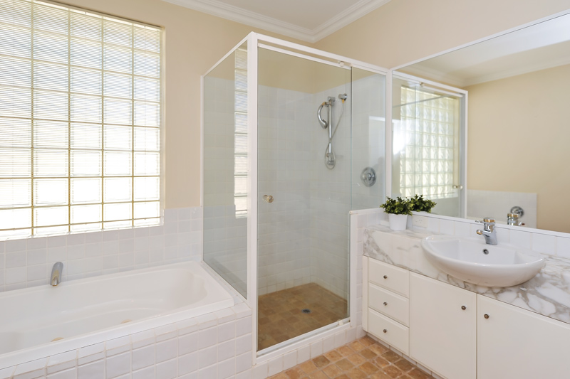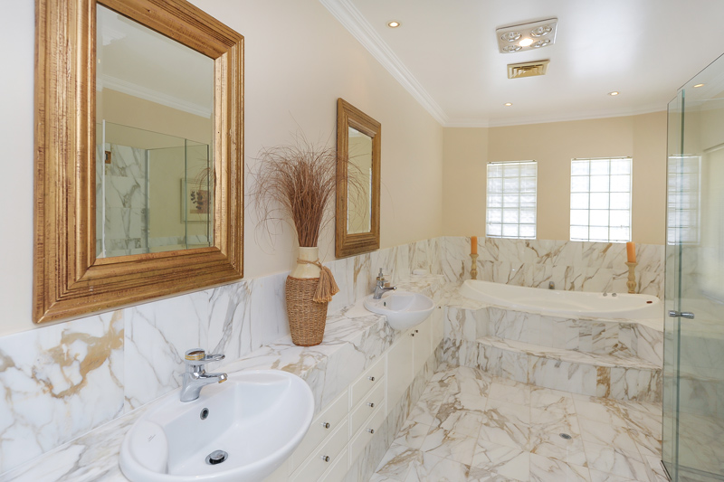 Elegant ensuite with spa bath, separate shower, double vanity and powder room