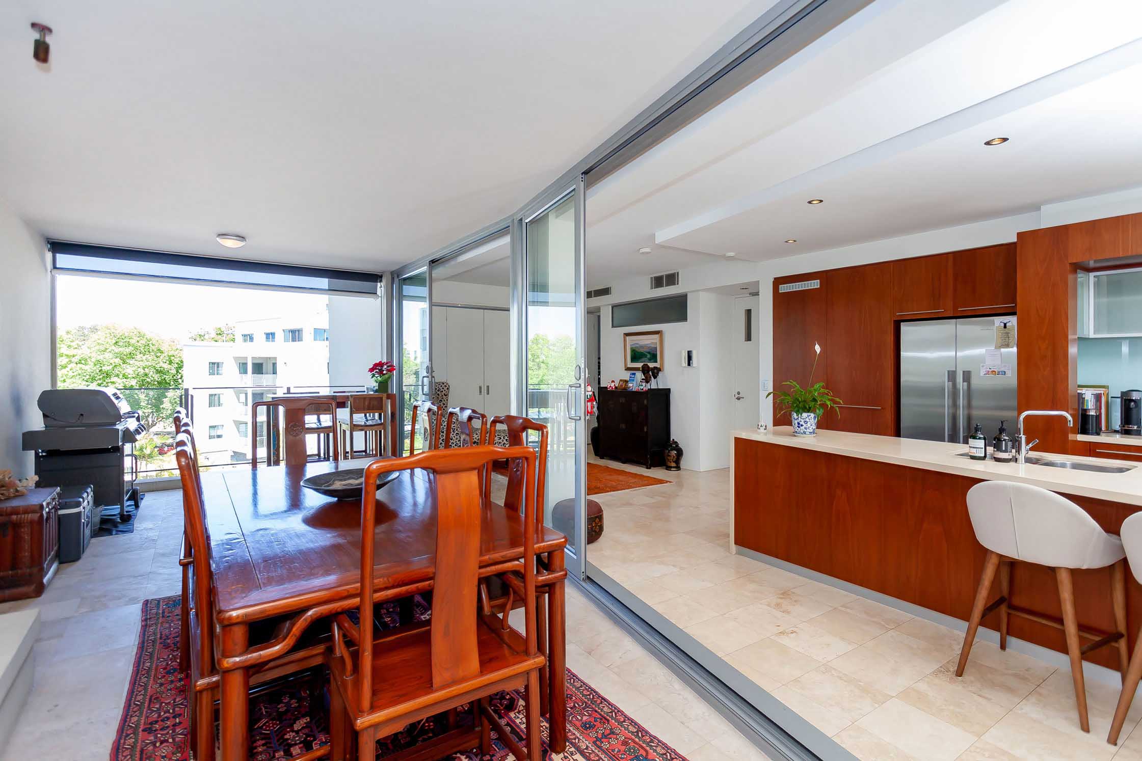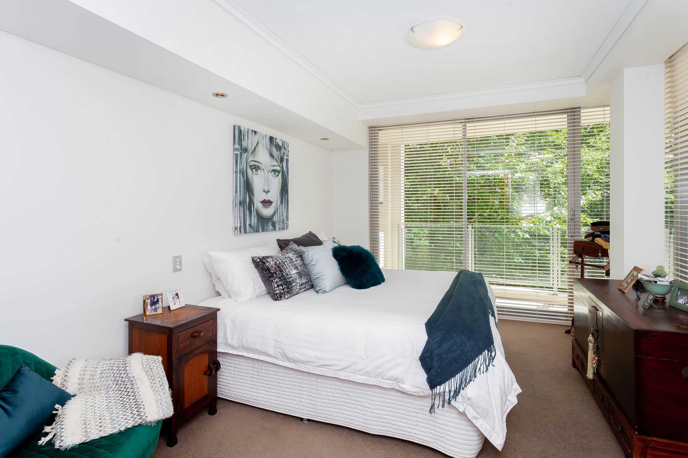 The apartment features open plan living and dining with multiple floor-to-ceiling glass sliding door access to enclosable entertainer’s size balcony, which provides a natural extension to the main living areas. The huge enclosable balcony displays views towards Matilda Bay and Kings Park, as well as towards the Hills and the City. The kitchen has lots of storage, splashback, island bench which is ideally located to enable conversation with guests or family.