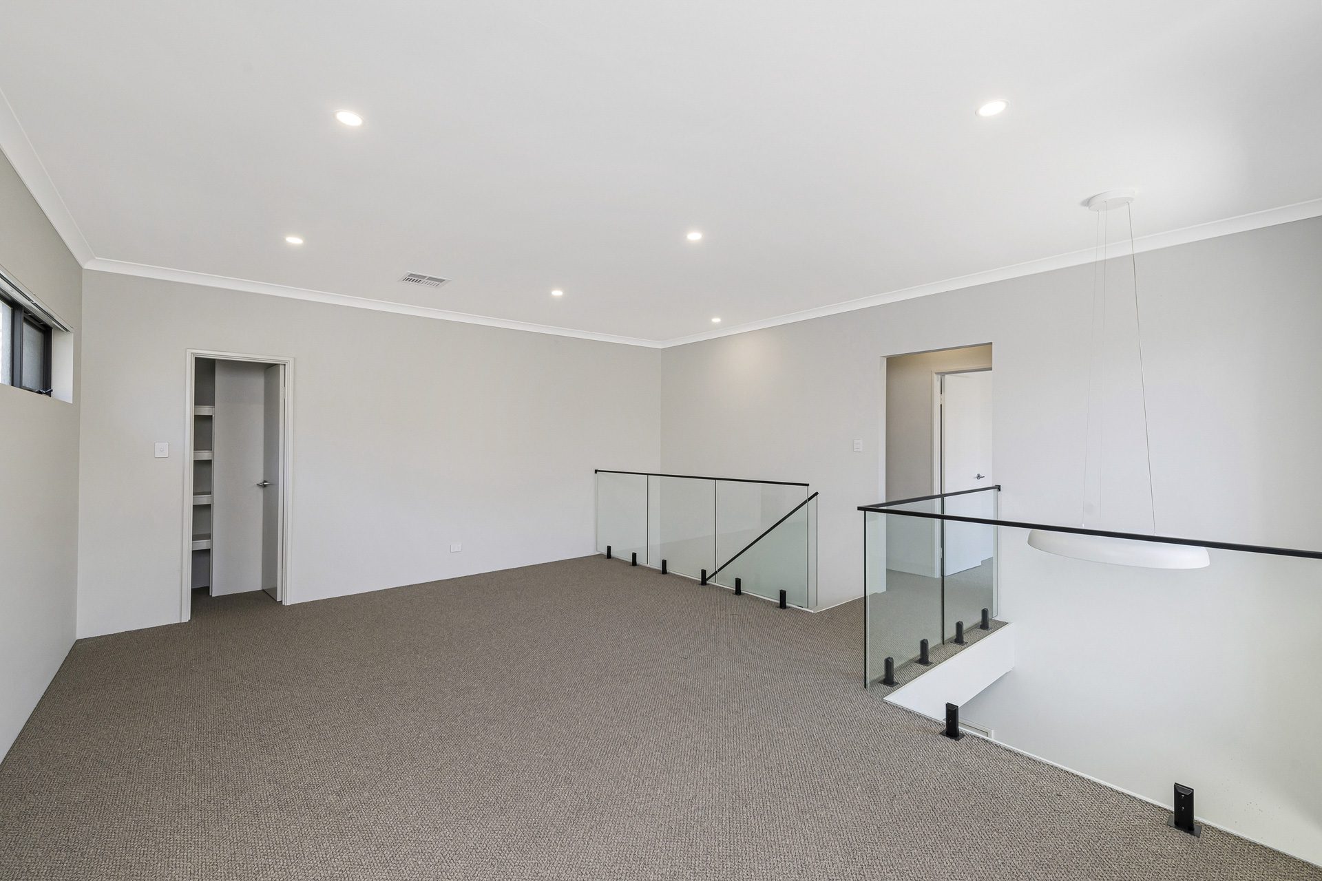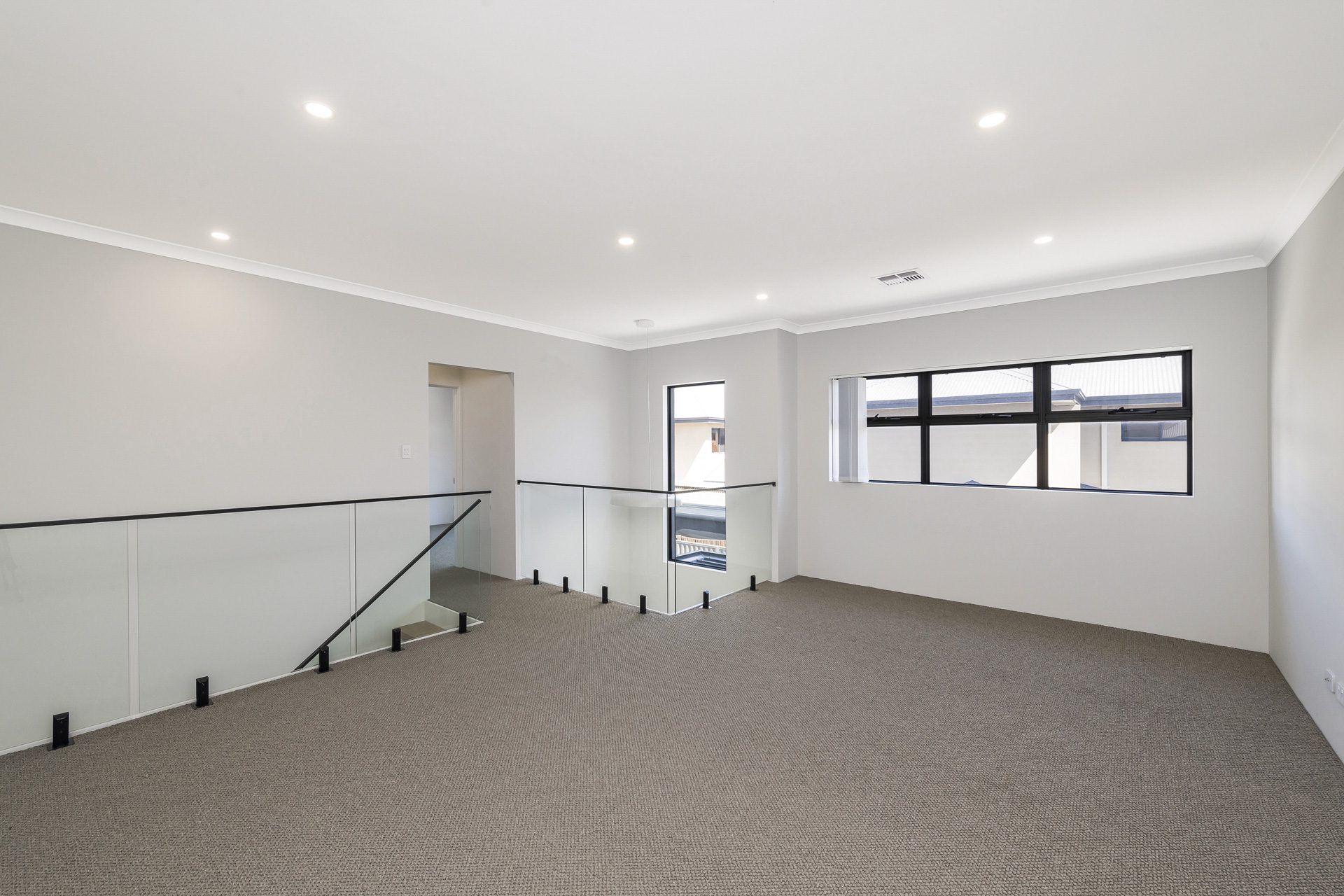 Upstairs, glass balustrades frame the stairway to a spacious second living area opening onto a large balcony with city skyline glimpses. The indulgent master suite features a walk-in robe and a luxe ensuite with double vanity, oversized shower and WC, all bathed in natural light from wall-to-wall windows.