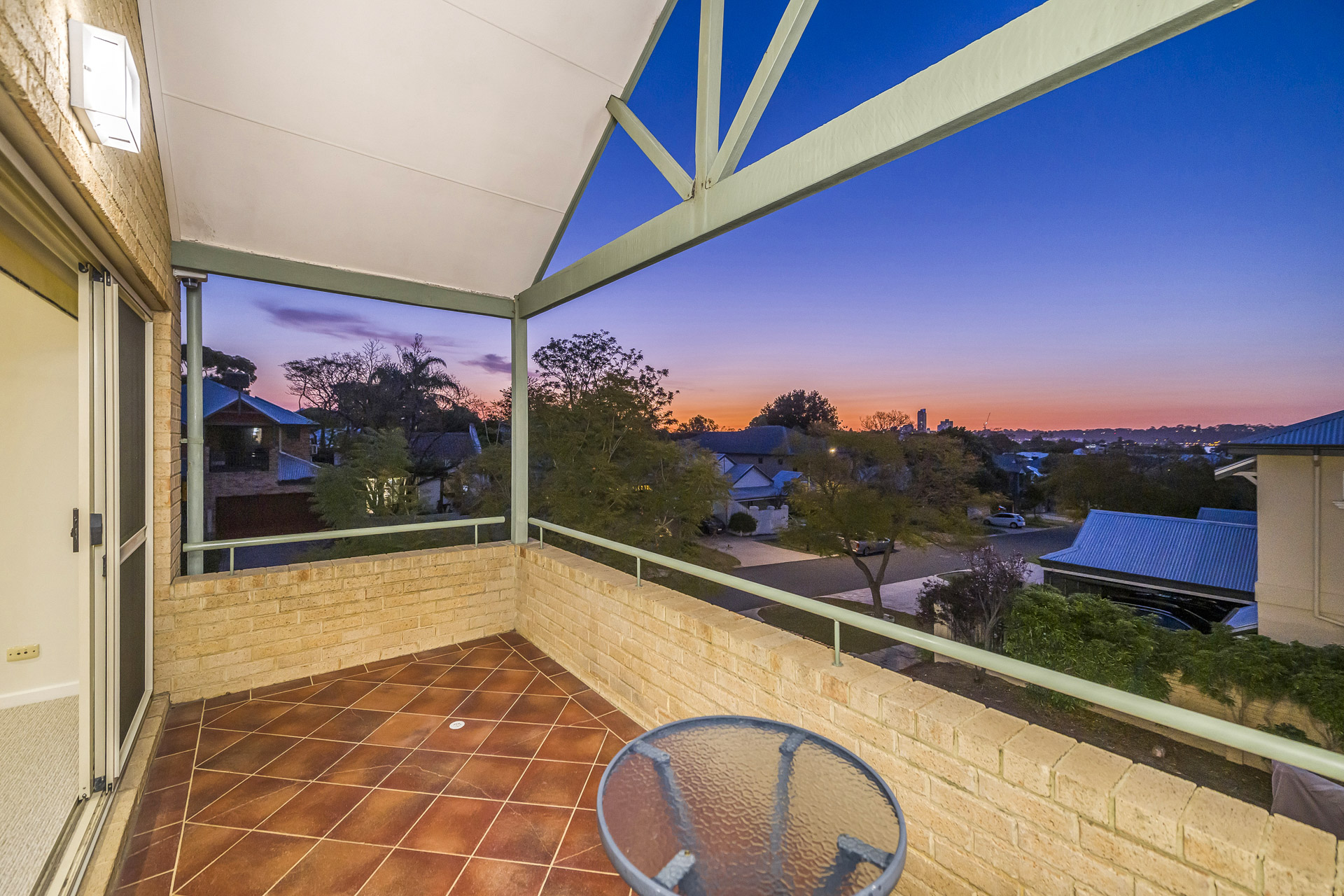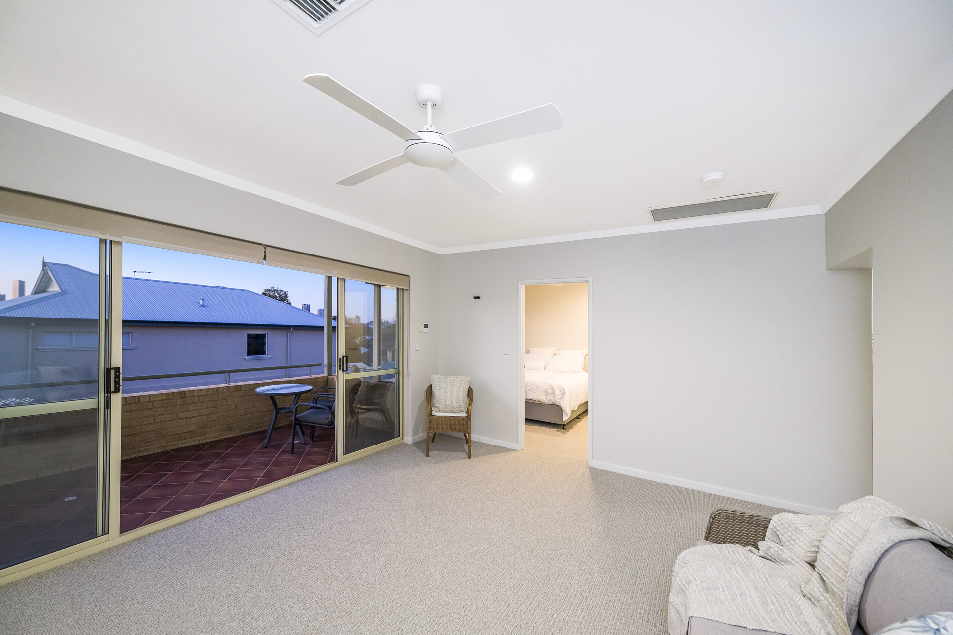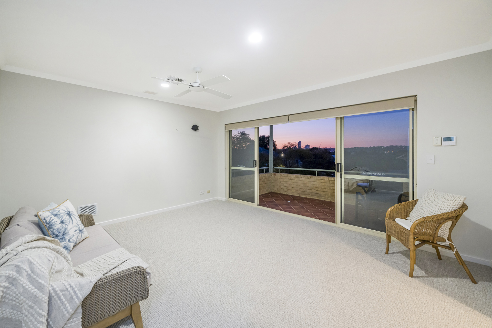 The versatile two-level floorplan provides over 215sqm of internal living, including a recently renovated designer kitchen with quality appliances, multiple living areas, a private main bedroom suite with balcony, and an upstairs retreat with views of Kings Park, the Swan River, & Optus Stadium.