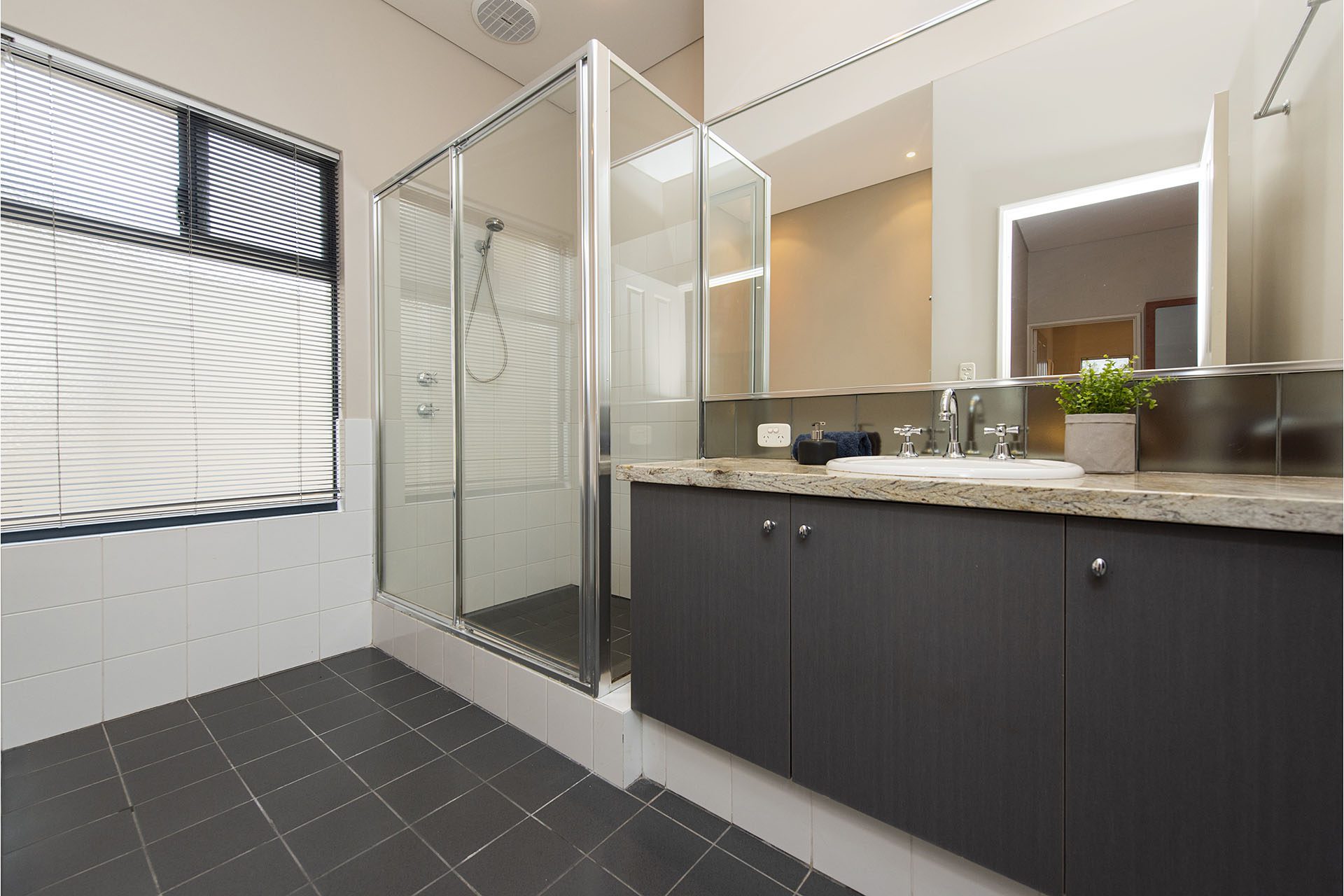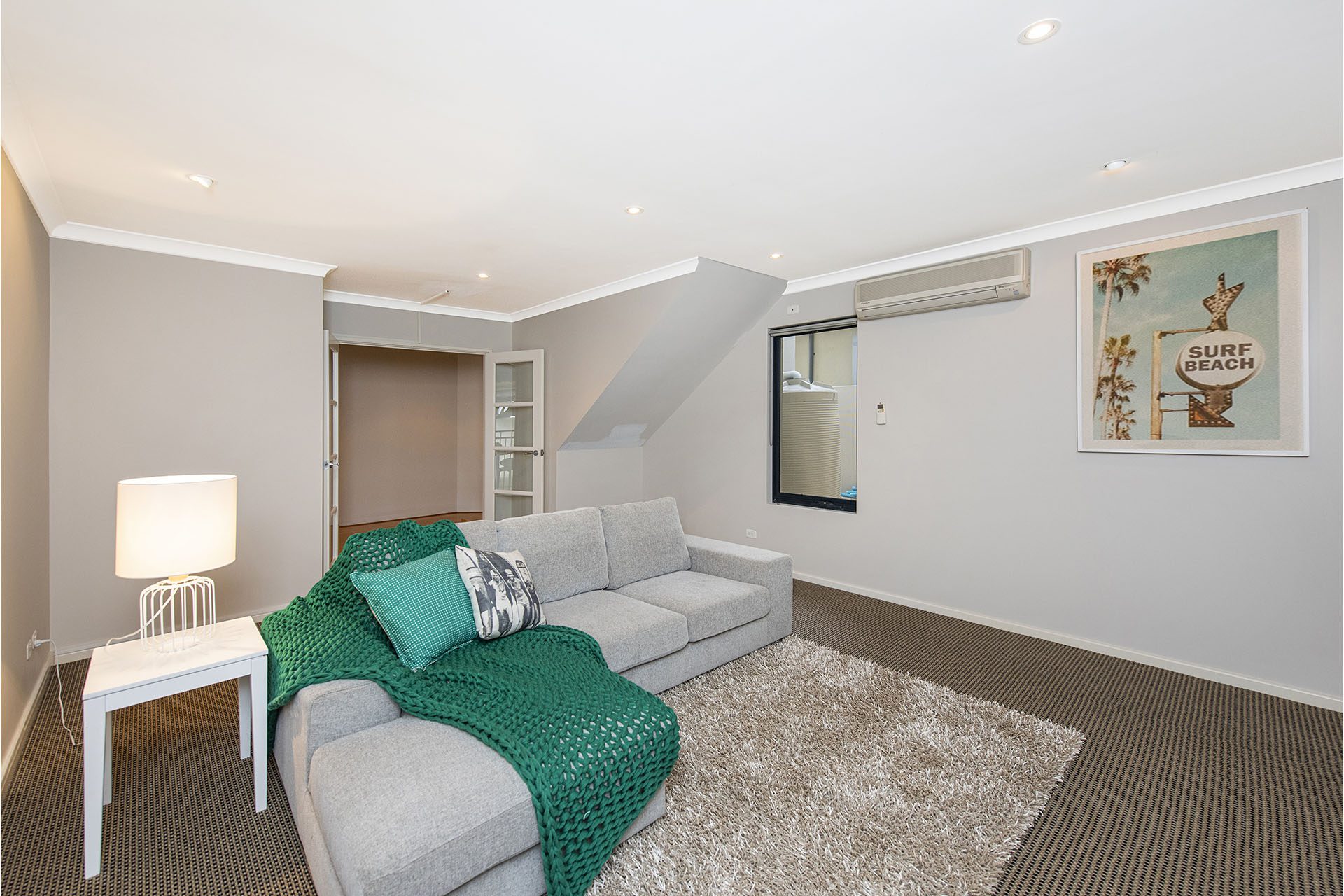 The home boasts bamboo flooring and high vaulted ceilings in the open plan living which opens out to the huge balcony (with retractable awning above) where you’ll sit for hours looking out to the lovely and ever changing views of Melville Water over to the boats of South of Perth yacht club.