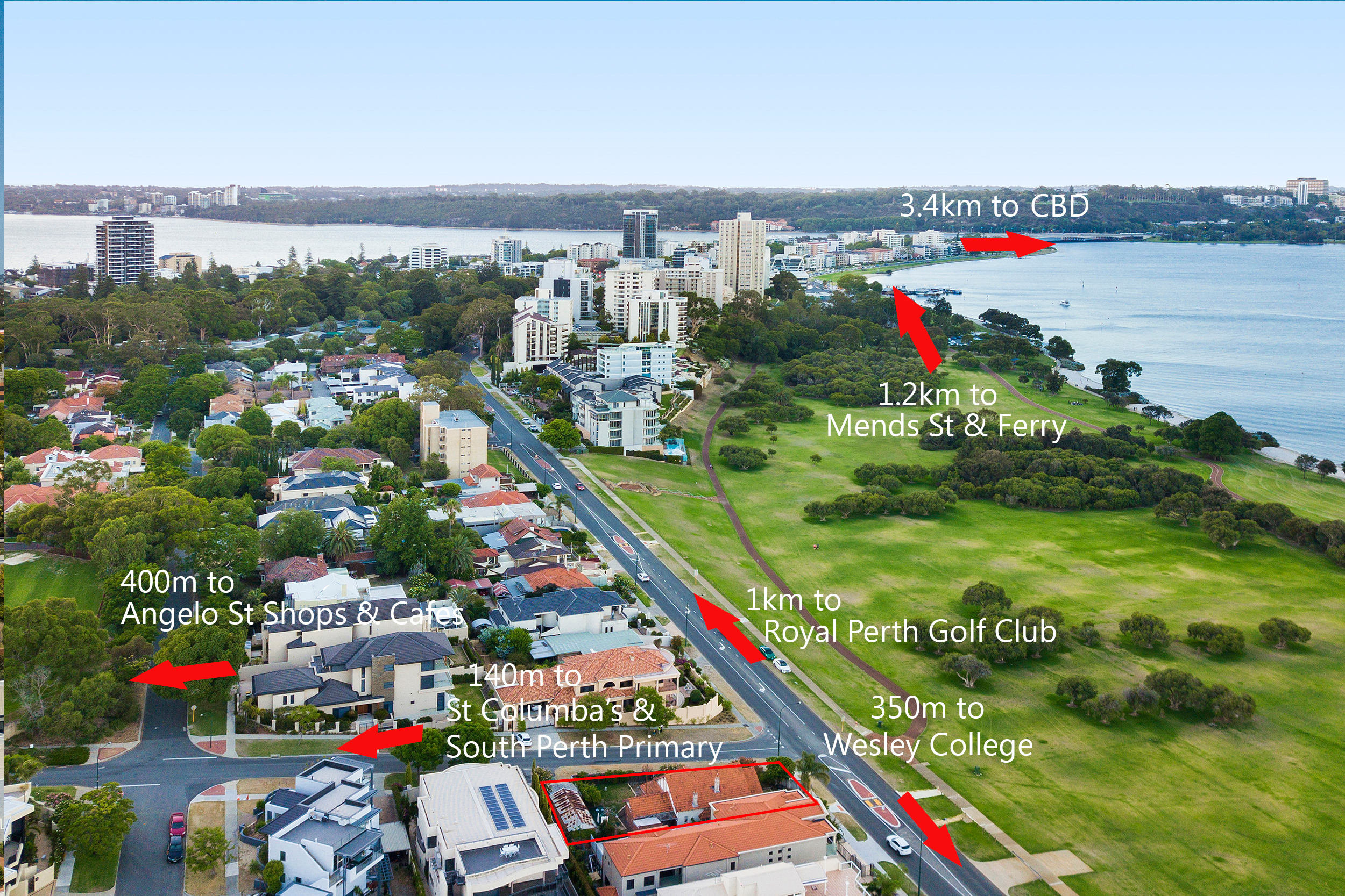 Set amongst luxury residences close to the revitalised Mends St Shopping Precinct featuring Perth bound Ferry, boutiques and restaurants to suit all tastes and also Angelo St Shopping Area; South Perth and St Columba’s Primary Schools; Wesley, Penrhos, Trinity and Aquinas Colleges and within easy access to most Perth suburbs via the major Freeways and Highways.