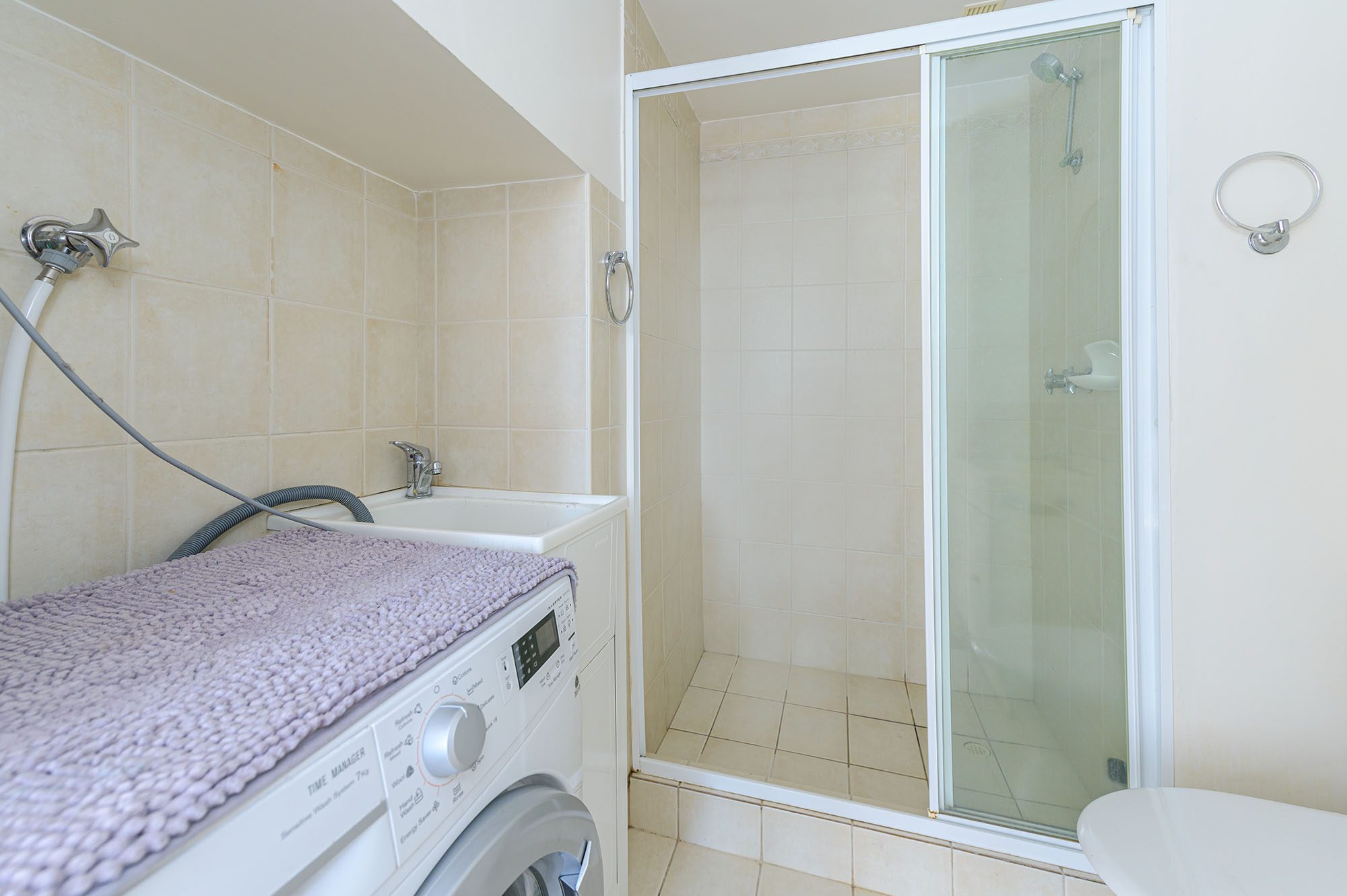 Laundry/bathroom in neutral tones – with Washer / Dryer Machine