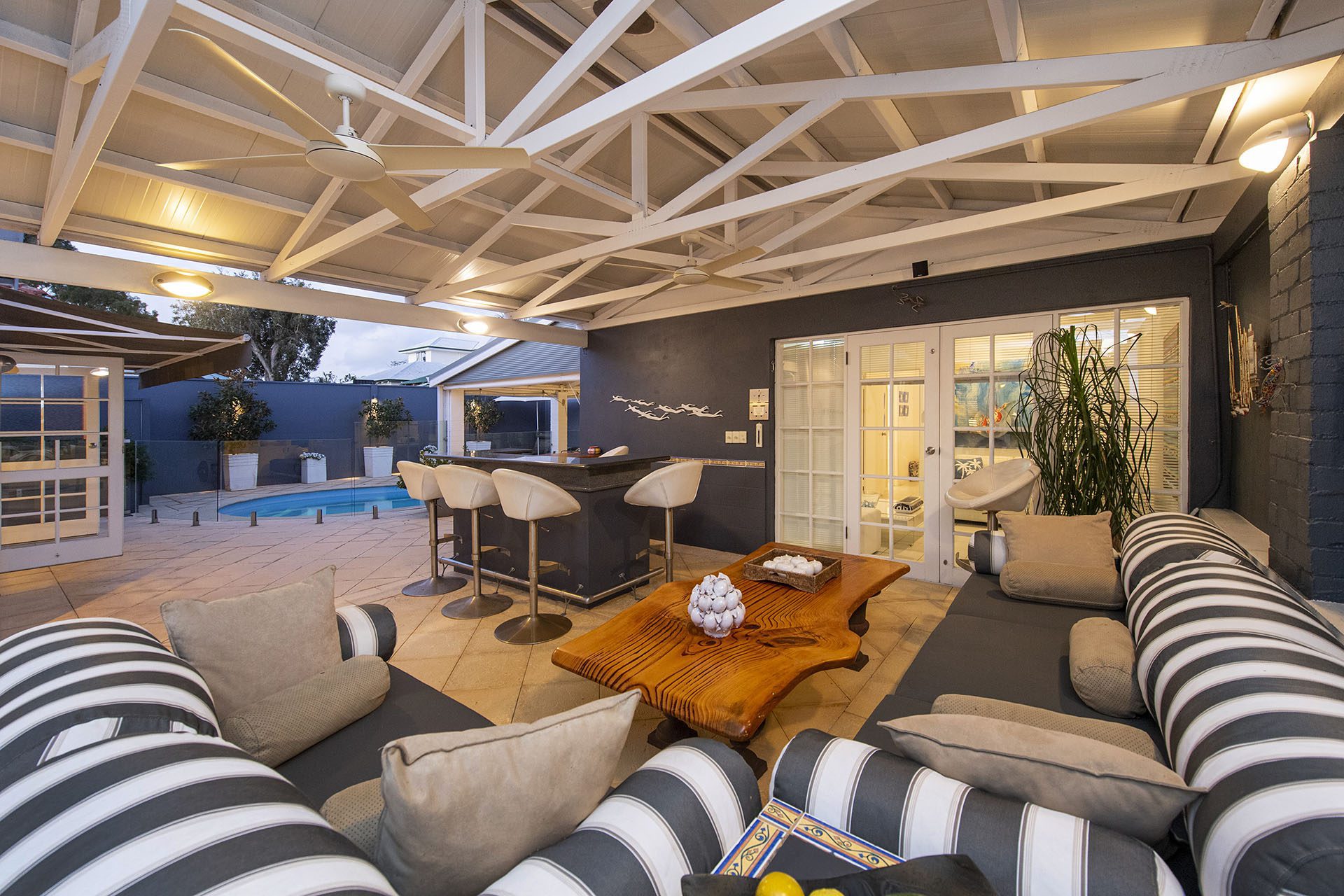 Behind the gate is a small manicured reticulated garden. A chandelier no less hangs inside the front porch. Impeccably styled with ornate ceiling roses and cornices, polished jarrah timber floors, windows dressed with white shutters a large fireplace in the lounge room, formal dining with french doors that open out to the beautiful paved path leading to an entertaining area like no other. The master bedroom will be your haven with an ornate archway over the bed. Walk-in robe with sliding doors and ensuite with a double vanity and shower plus WC. A door from the ensuite leads out to the paved path with it’s hedged garden bed also leads to the under cover entertainment area with built in cushioned seating and outdoor bar.