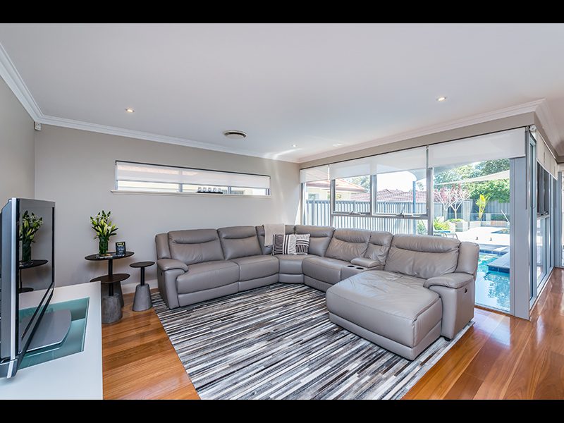 Stunning blackbutt timber floors flow through the lower level of the home and into the open plan kitchen, dining and living area. Floor to ceiling windows provide plenty of natural light and brings the outside in with outlook over the pool – perfect for parents to keep an eye on the children from the inside of the home. A “no expense spared” alfresco area for all year entertaining has been designed to make the most of the Perth weather. The recessed timber panelled ceiling complements the decking and outdoor kitchen which comes complete with a pizza oven!