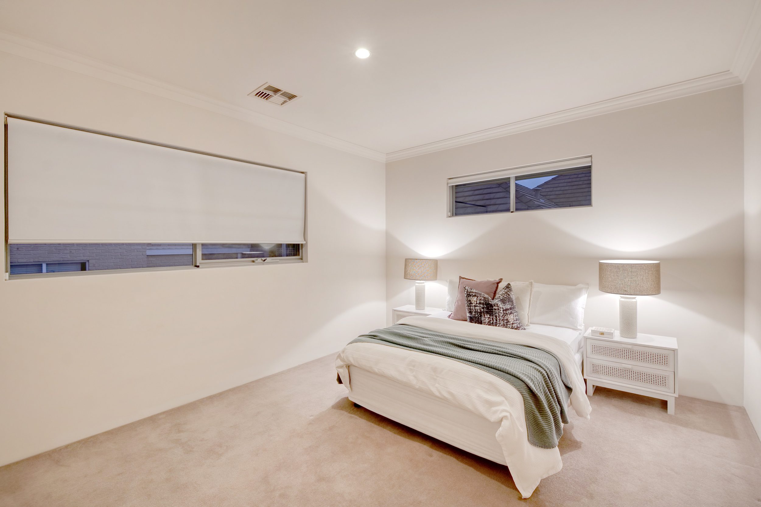 The master bedroom on the ground level is carpeted with his and hers walk in robe a large ensuite with heated flooring, with a large bath, double vanity, separate shower and separate WC which doubles as a powder room for you and your guests.