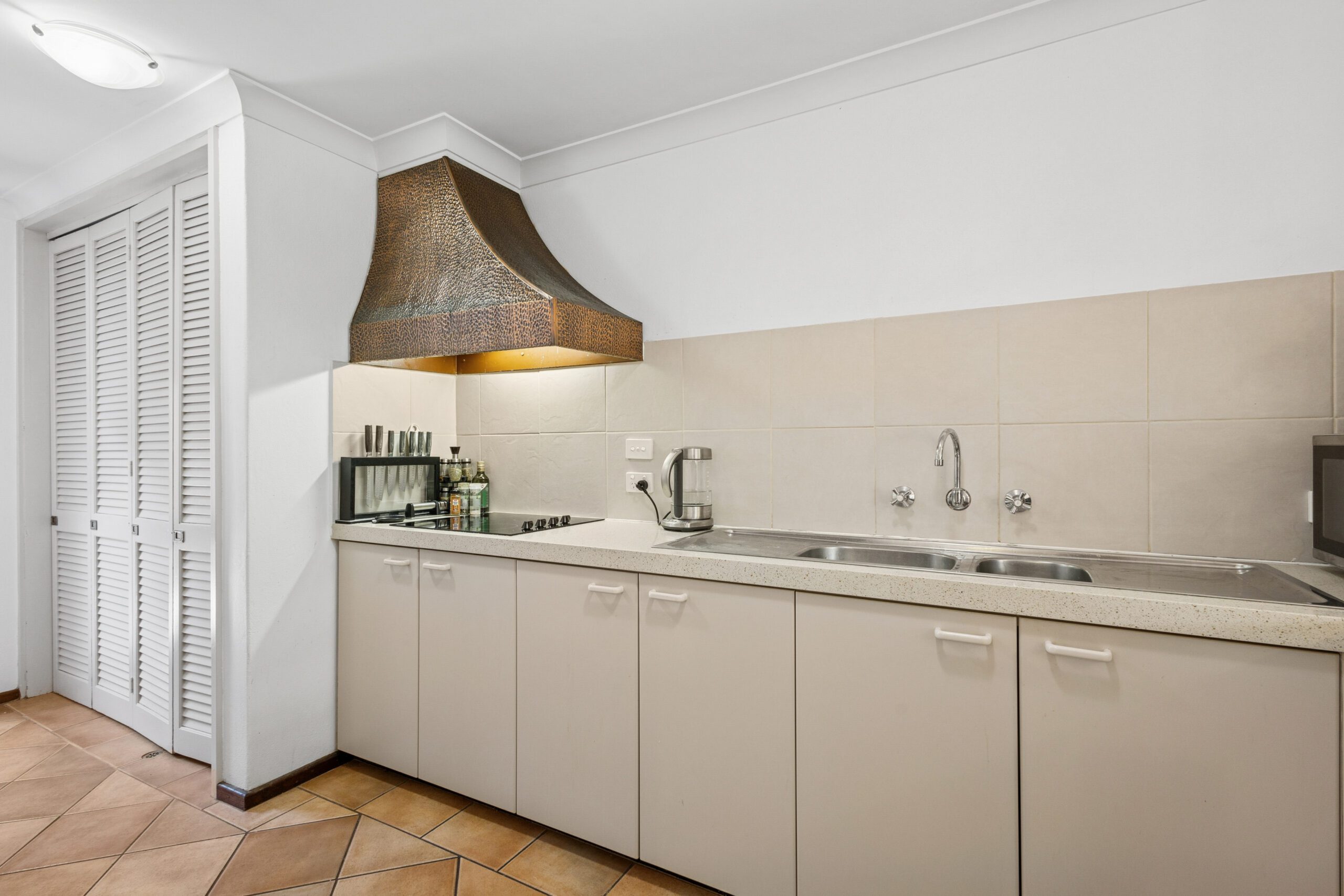 The good sized kitchen has a breakfast bar, built in pantry, double sink, cooktop and wall oven. The laundry is conveniently located next to the kitchen tucked away behind concertina doors and access to the outdoor space.