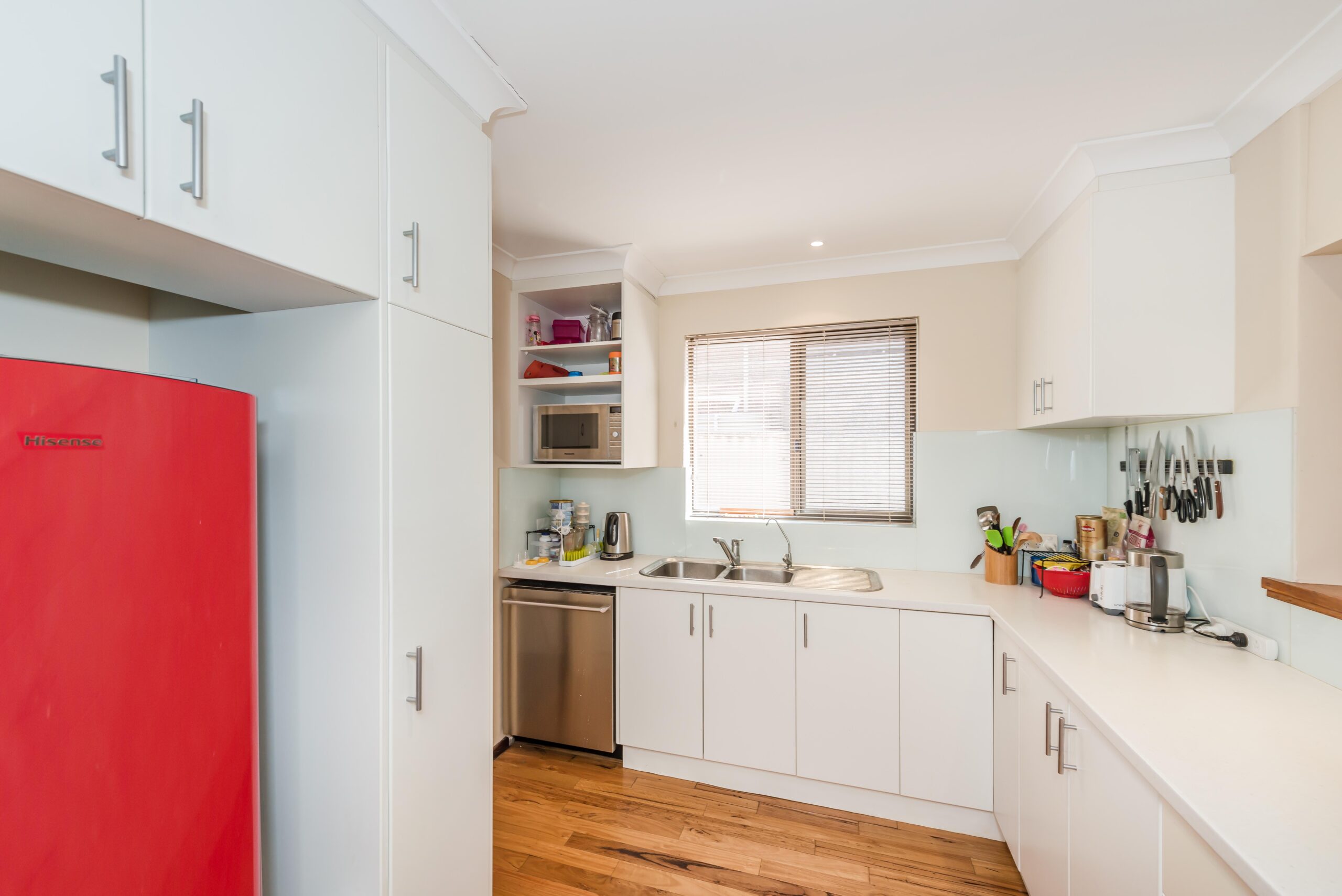 – Renovated kitchen with glass splashback, induction cooking & stainless steel appliances including dishwasher