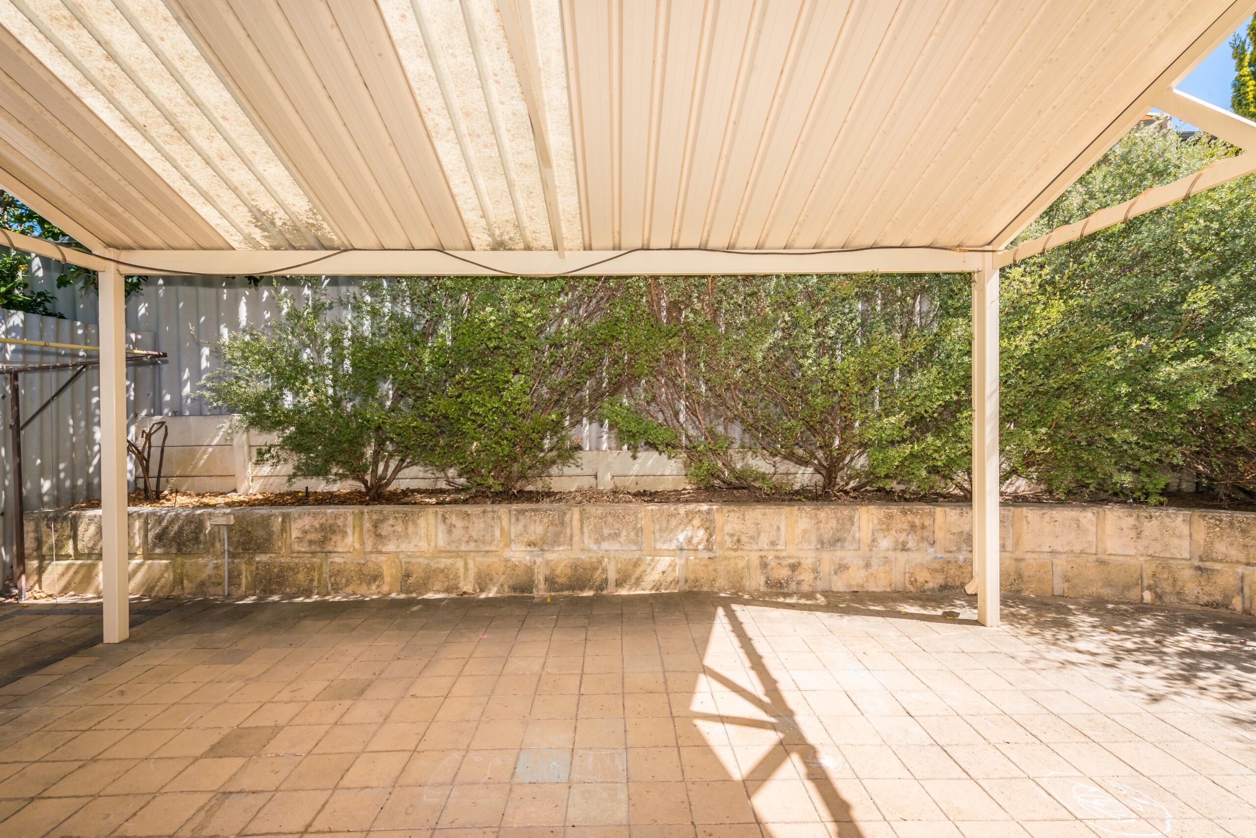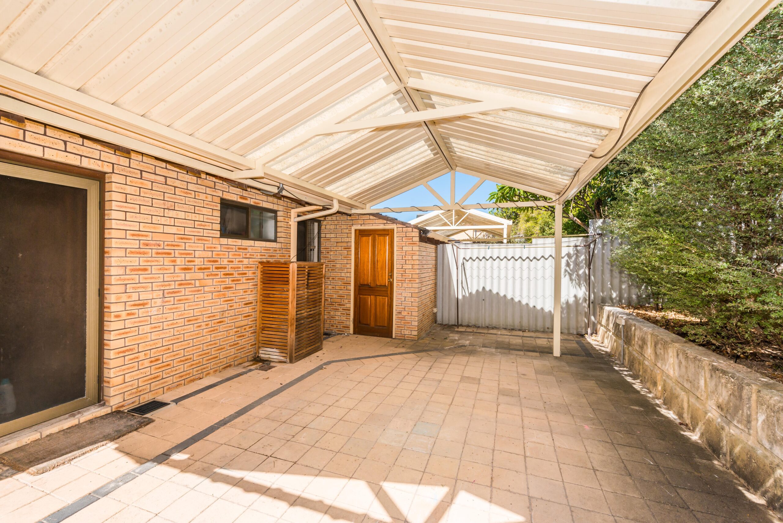 – Pitched roof patio covering paved rear courtyard