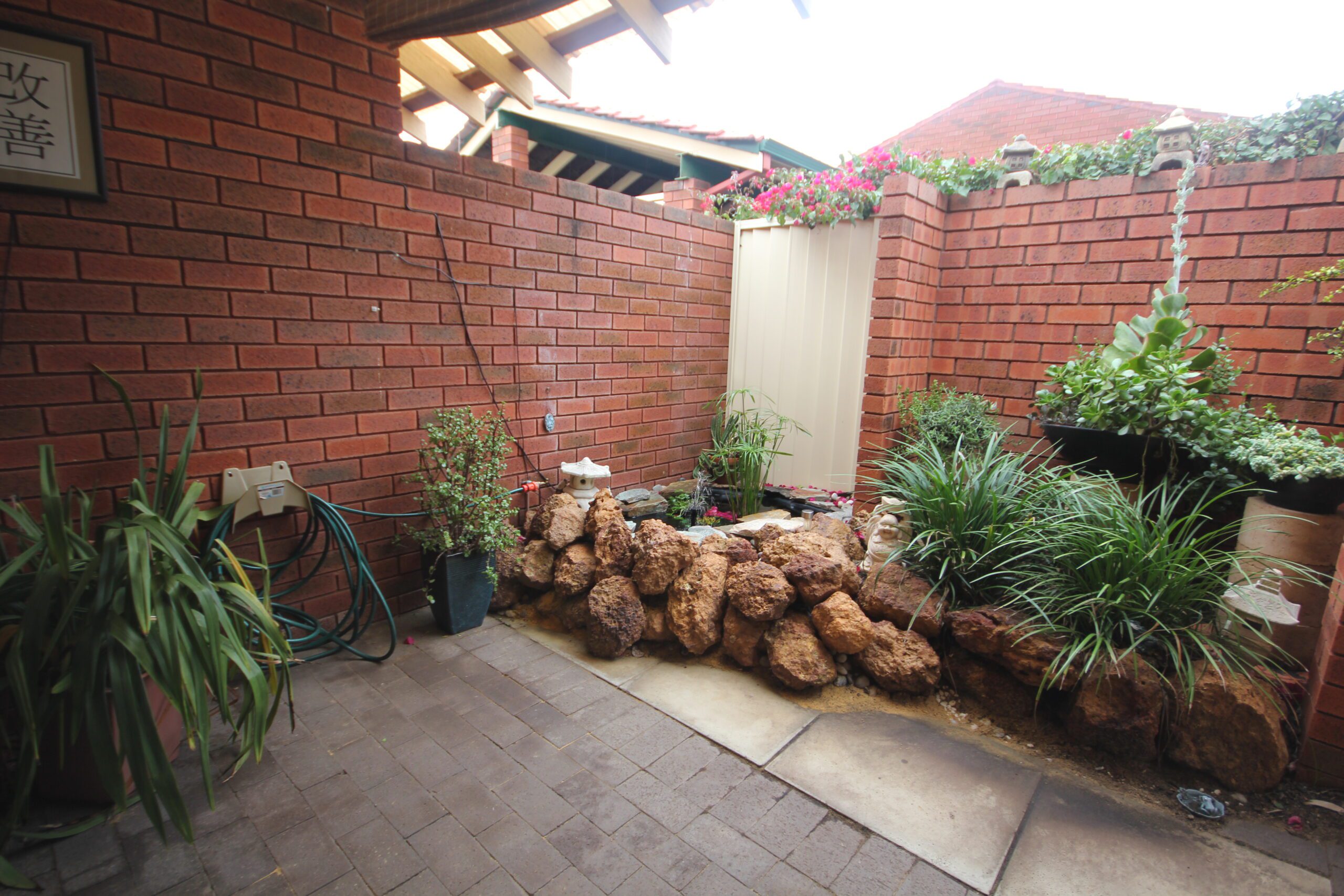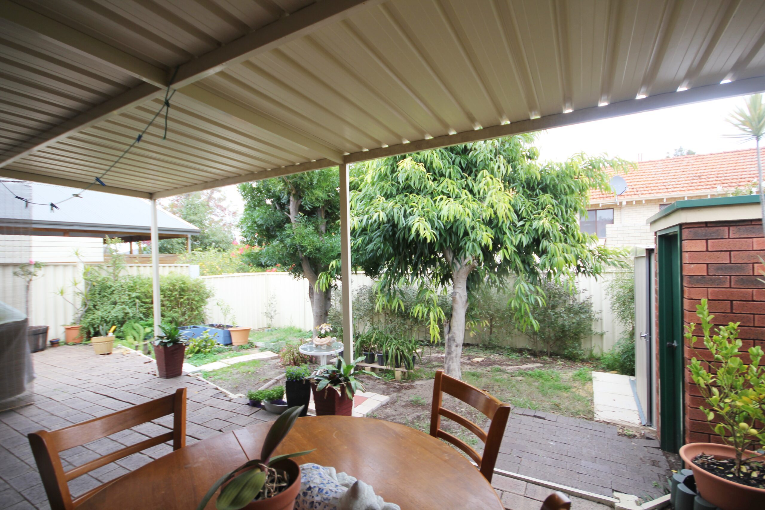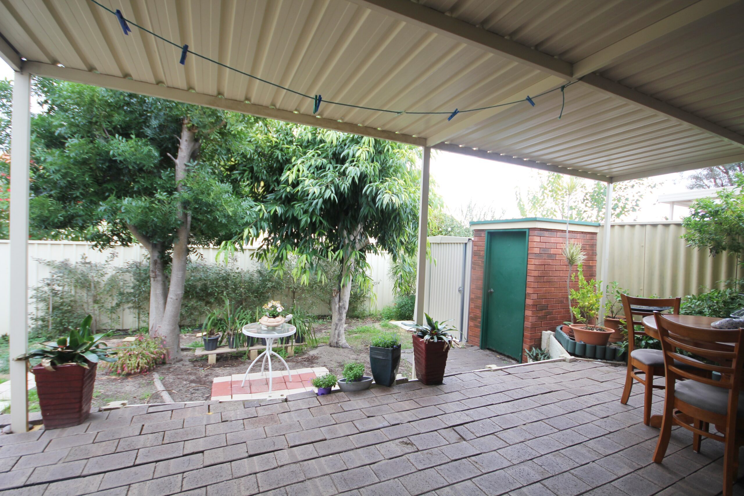 The rear of the property is the perfect size for minimal garden/lawn upkeep and also a paved undercover alfresco area.