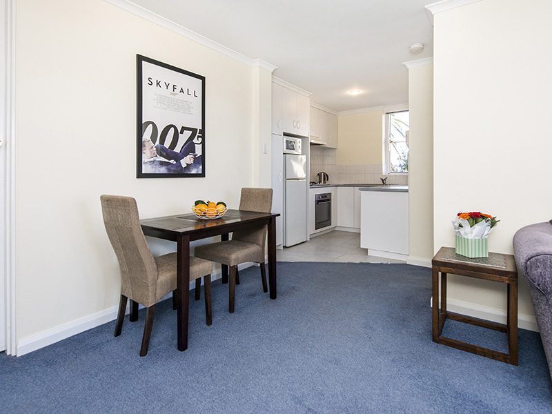 Internally the apartment is neat and tidy, composing an open plan living/dining area adjoining to a kitchen that features quality appliances. The living area flows out to a balcony that captivates spectacular panoramic river views of Melville Waters.