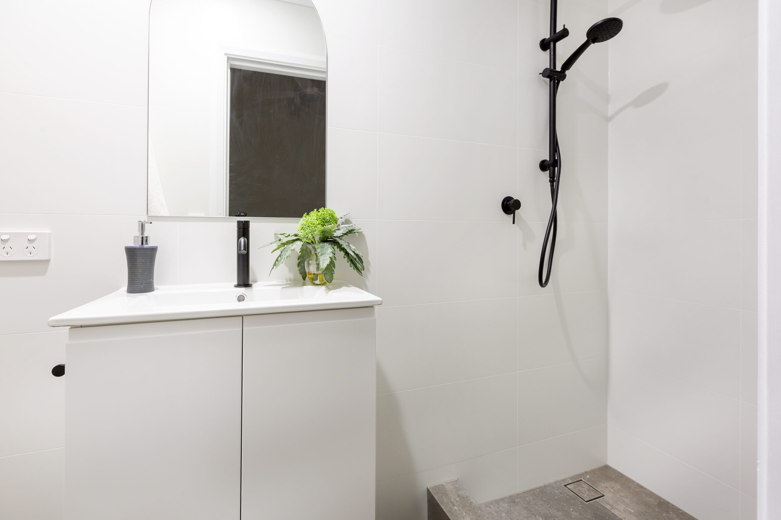 The space next to the kitchen offers possibility for a downstairs living area or dining space. There is also access outside to the grass area with a generous sized lock up storeroom. The downstairs bedroom is double sized with a ceiling fan and is serviced by a modern bathroom with a vanity, shower and toilet.