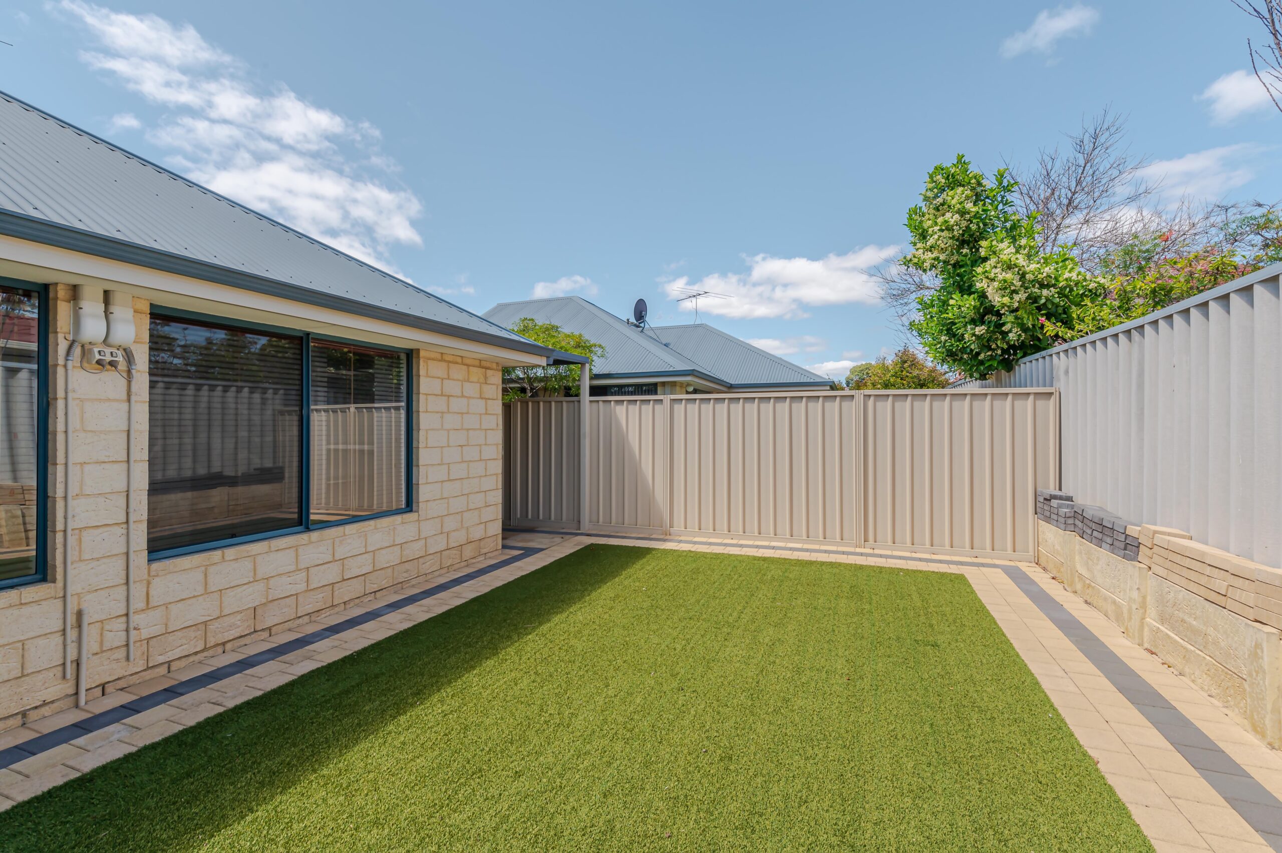 • Synthetic turf front and back, easy care gardens