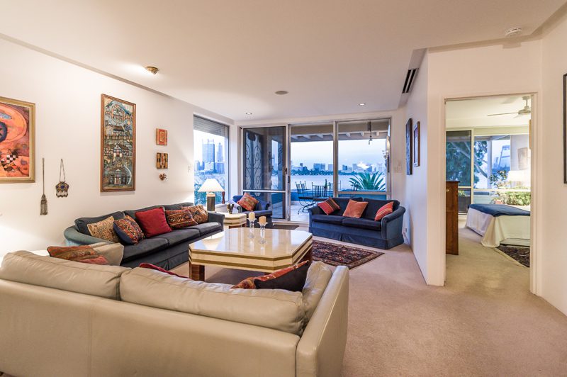Wake up to 180 degrees of river views from the master bedroom – floor length windows allowing in natural light, and views of the river, Perth city and Kings Park. The second bedroom has built in robes, spacious sitting area and private balcony.