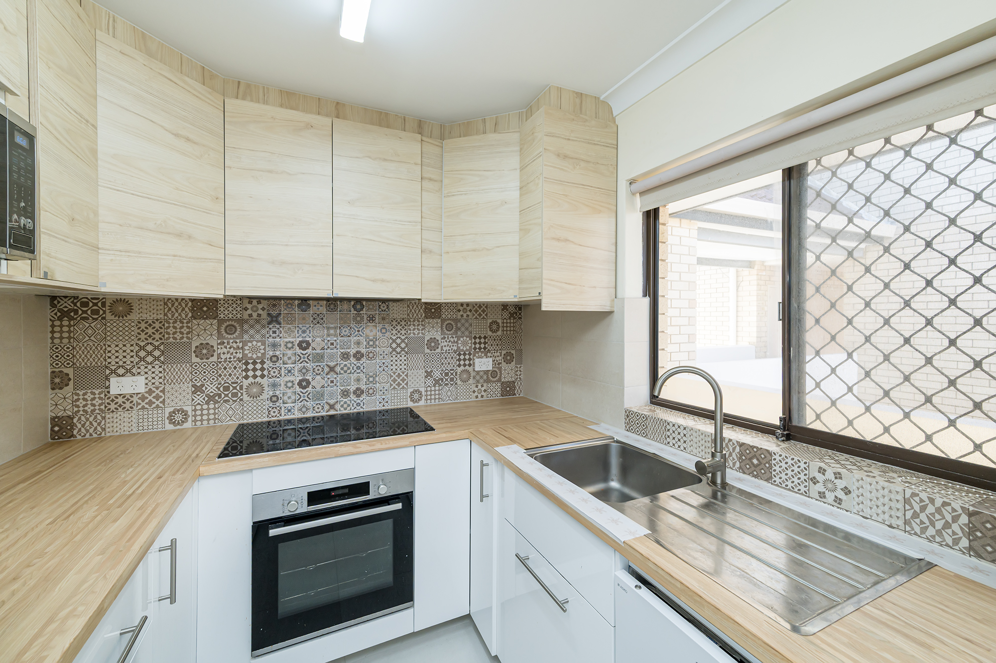 Interior of unit contains electric cook top, dishwasher, microwave and fridge. Bathroom laundry combined with washing machine included.