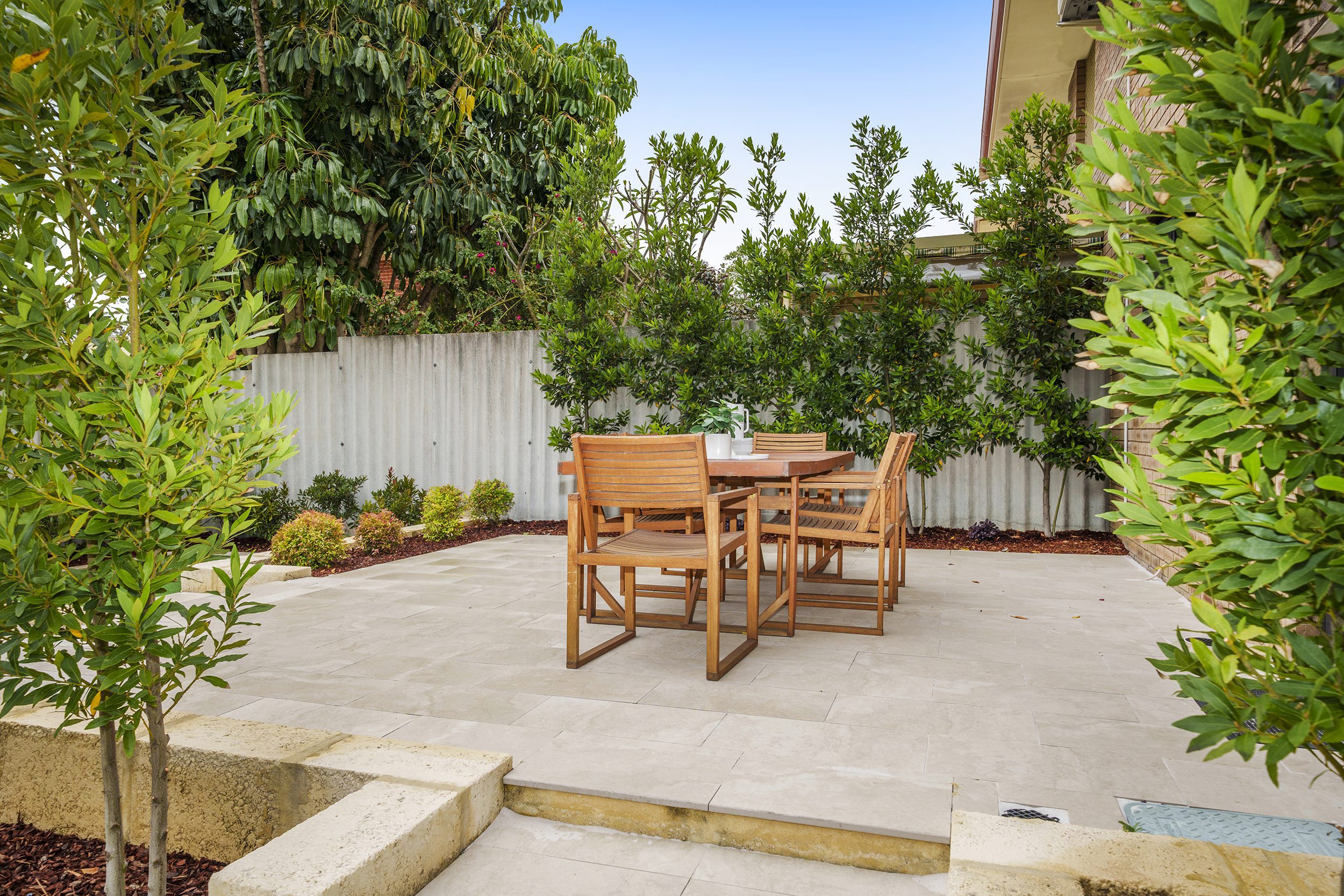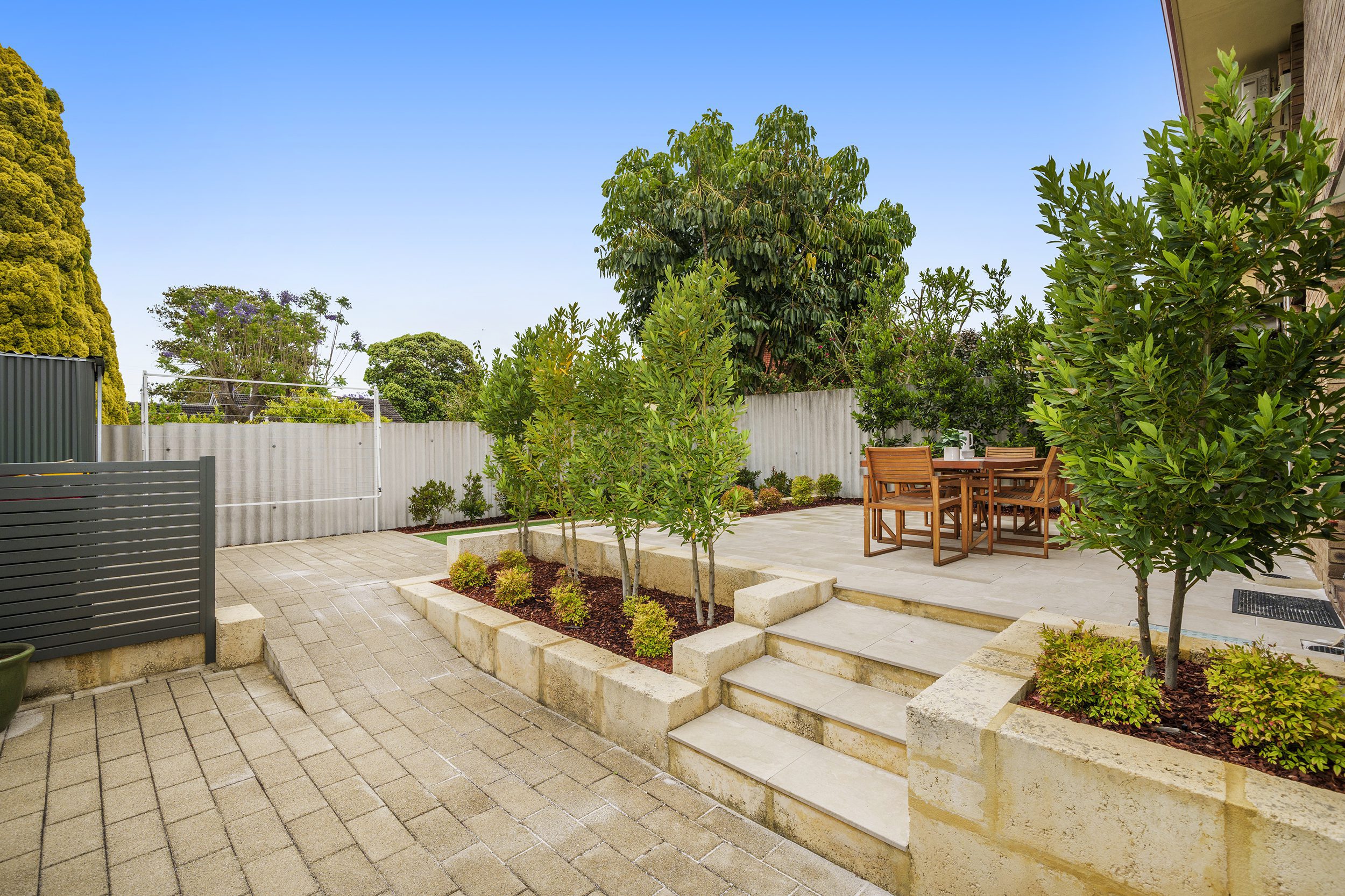 The tastefully renovated laundry has lots of storage behind double doors. Next to the laundry is a WC. Access to the entertainers dream of a terraced backyard is via the laundry, with large paved entertaining area which looks down to the lower garden, with garden beds, one of which has a row of trees screening you from the next door neighbours.