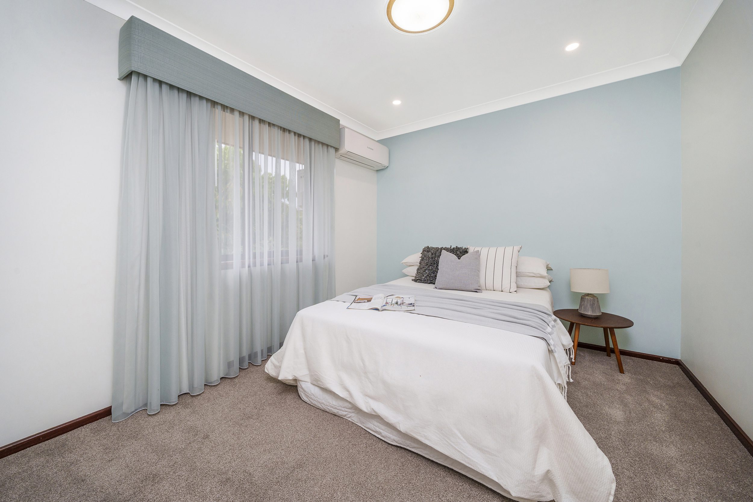 Upon entry is the open plan living / dining area with solid Jarrah timber floors underfoot with quality window treatments consisting of sheers and blockout curtains. The living area has sliding door access to the front courtyard where you can enjoy a morning cuppa.