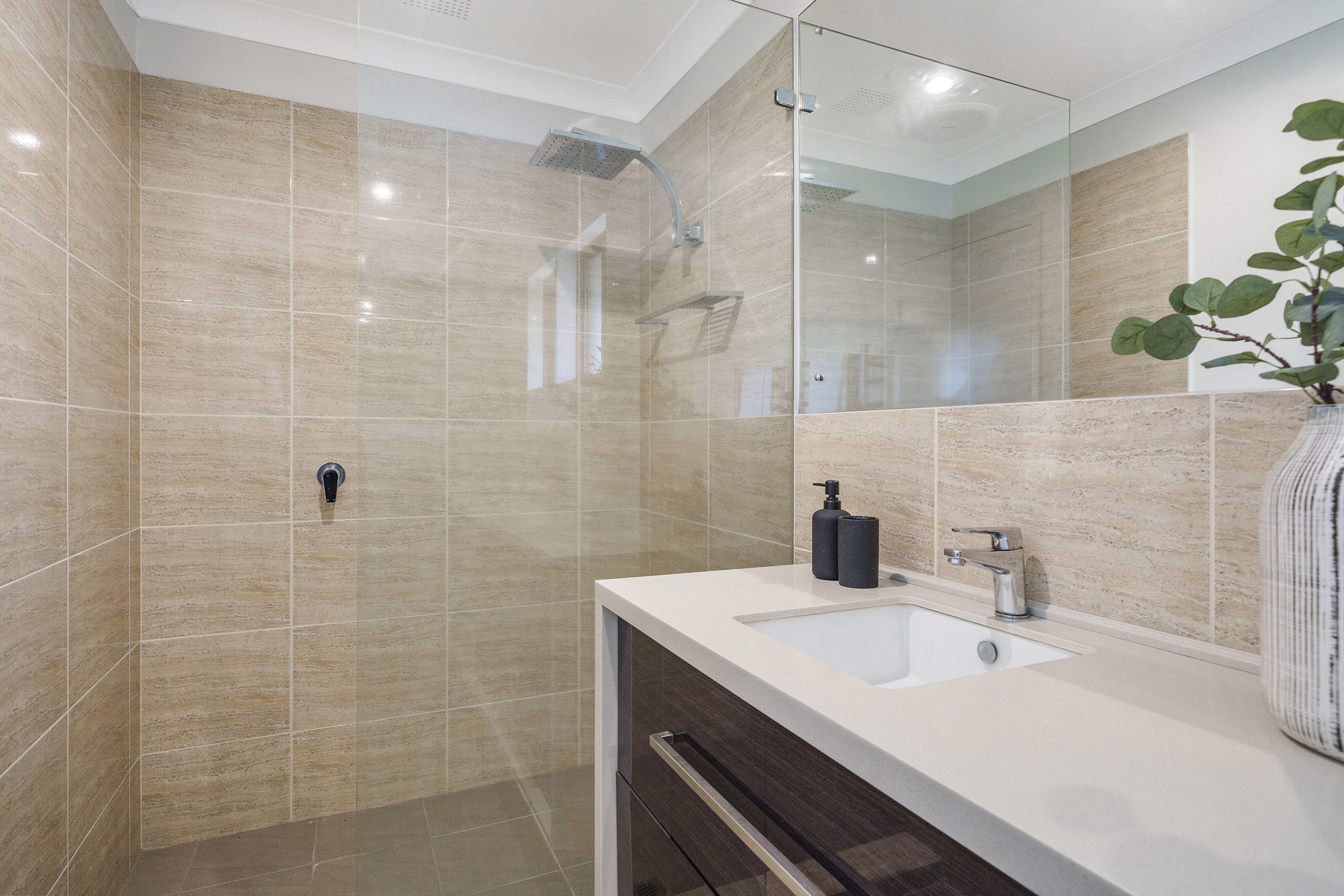 The bathroom is tastefully done with double vanity and a bank of four large pullout drawers. A heated towel rail no less and a large double shower. The WC is separate.