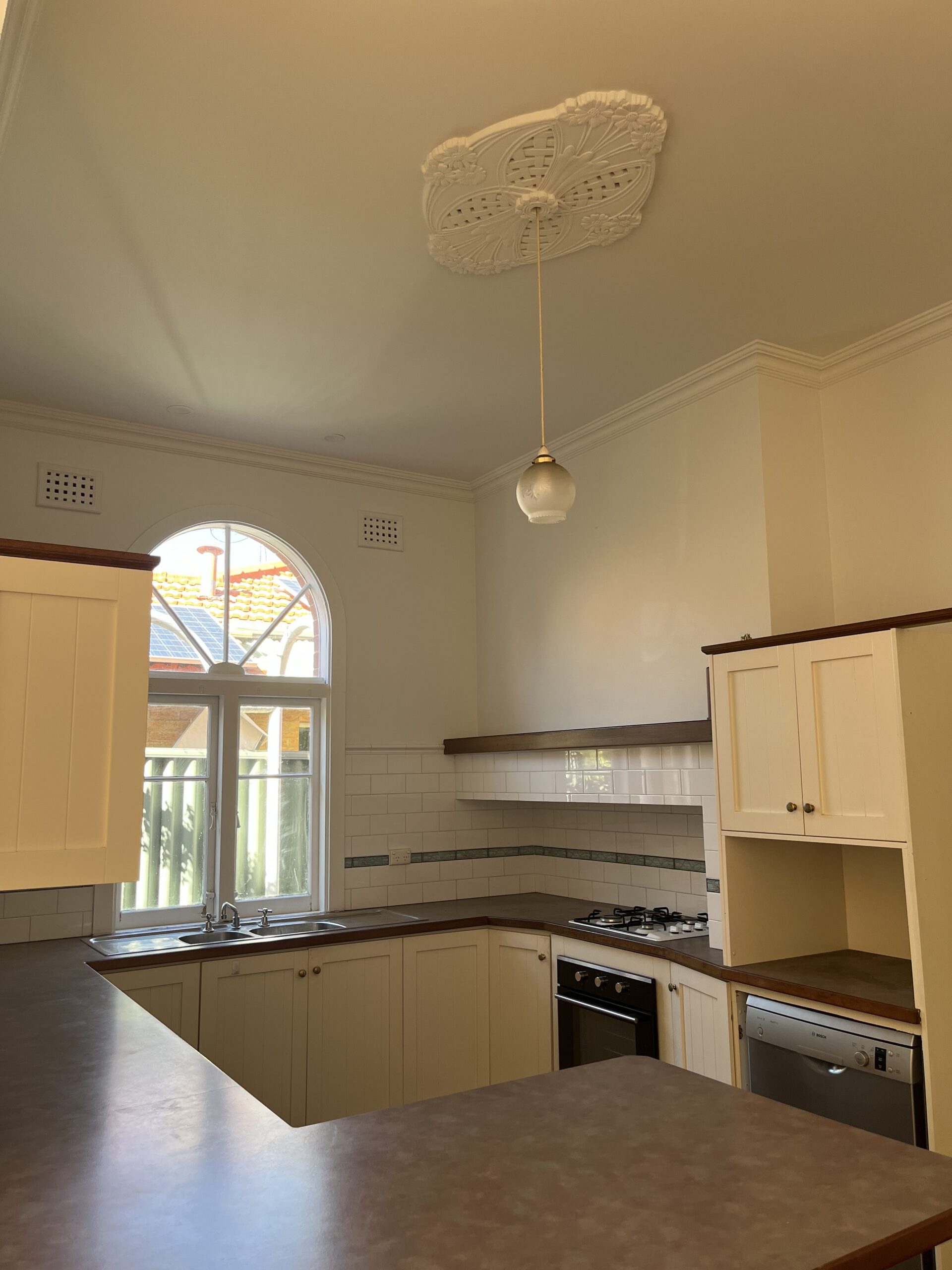 Large kitchen with gas cooking and breakfast bench