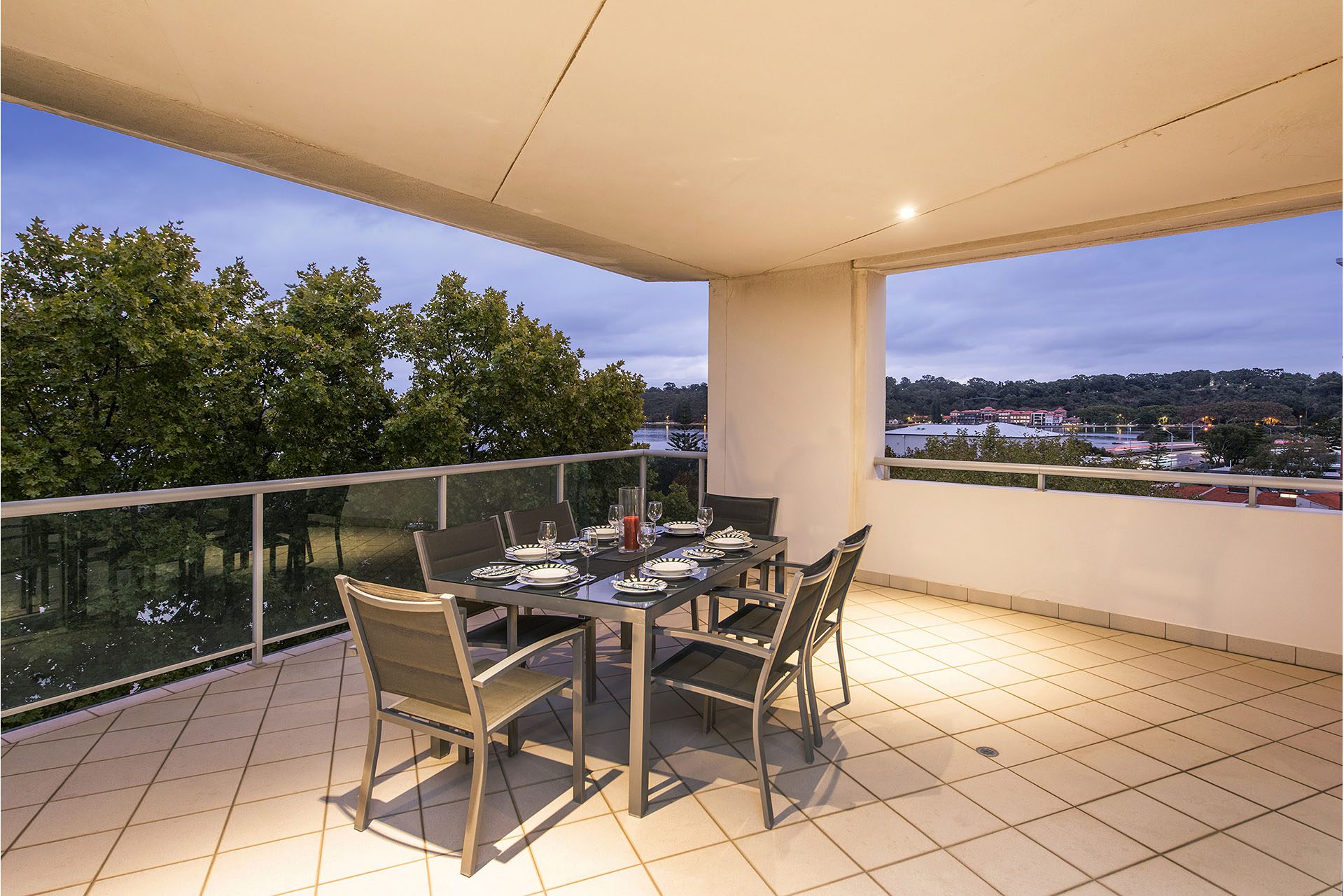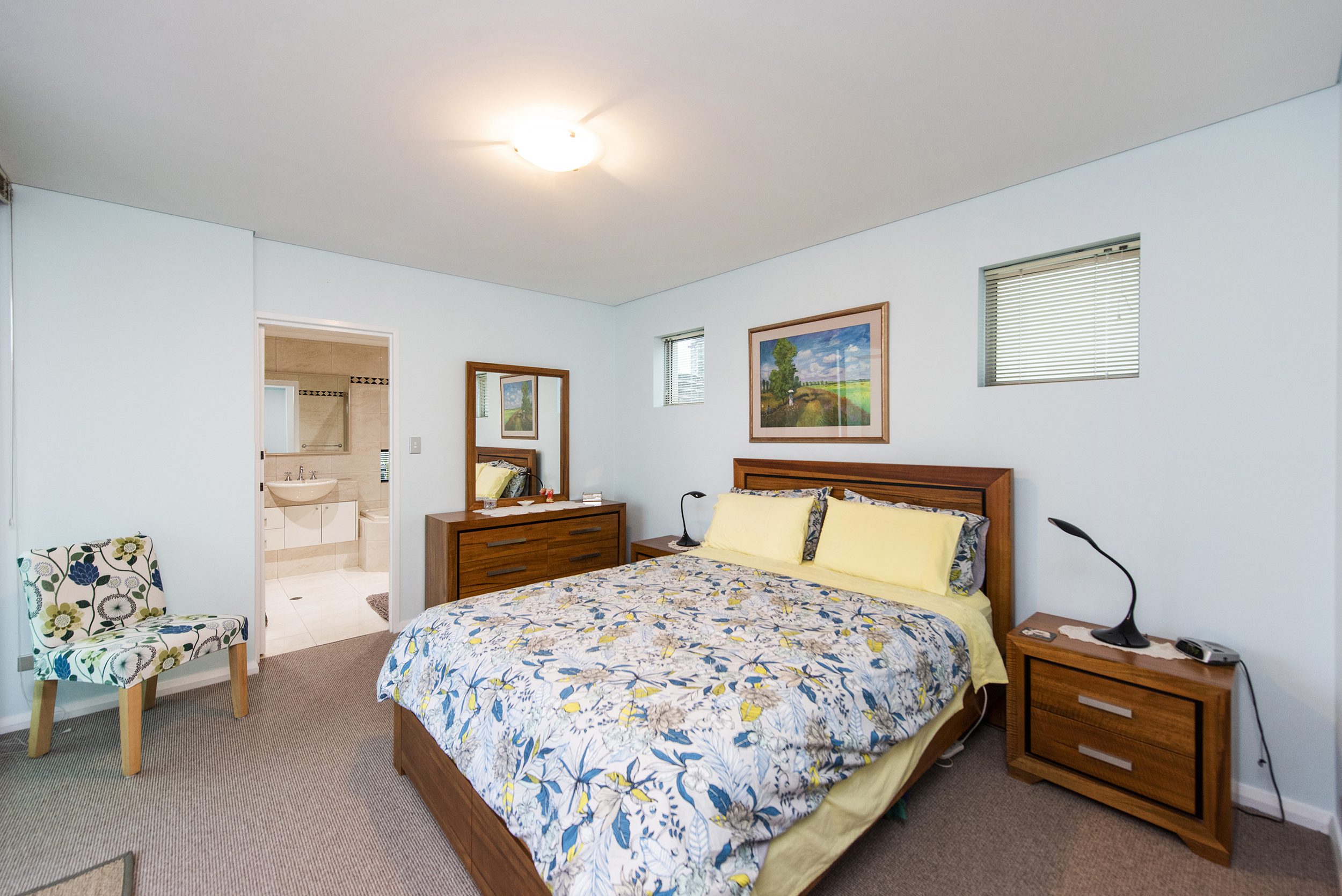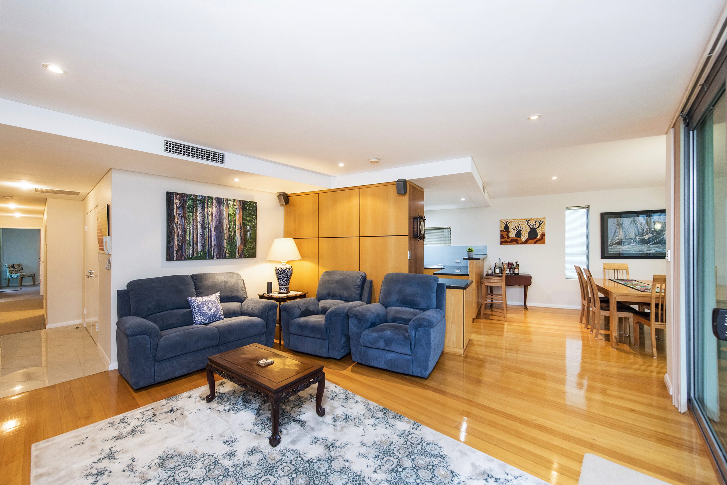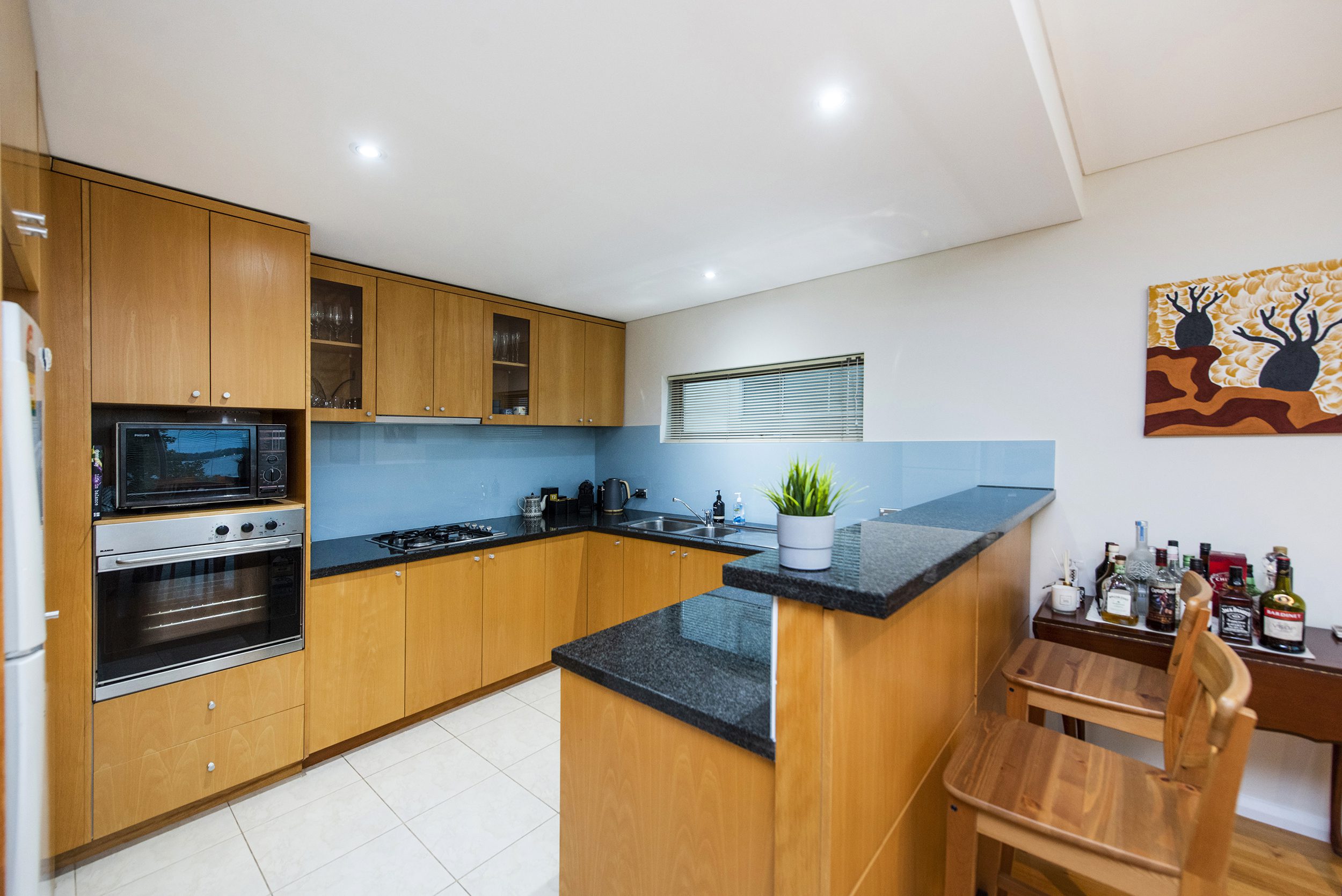 The kitchen is of a good size with plenty of cupboard and bench space, overlooking the dining area with floor to ceiling windows looking out to Melville Waters. The main bathroom has a shower/bath and vanity with a separate powder room close by.