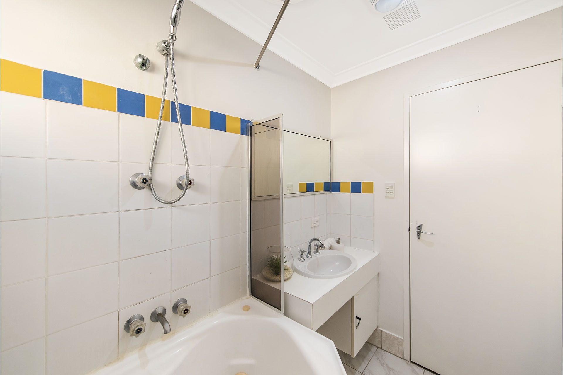 The bathroom has a bath/shower, vanity and separate toilet.