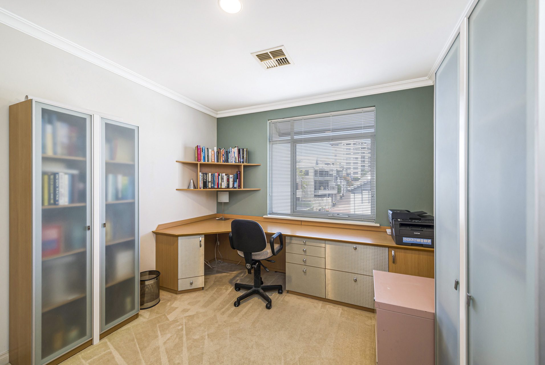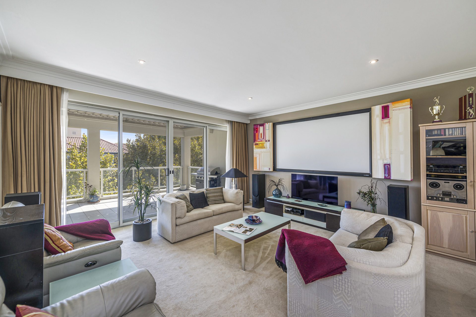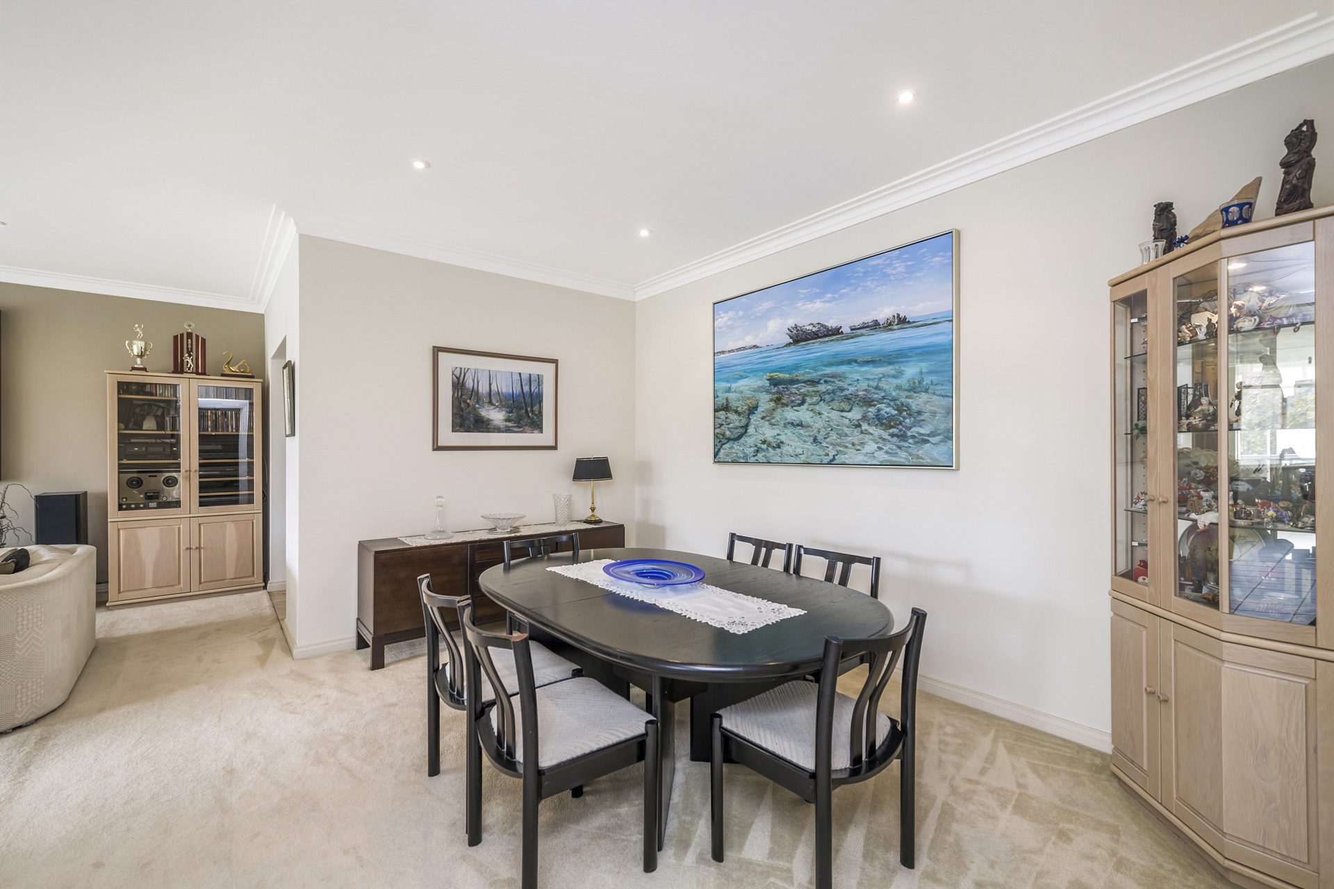 The light-filled family room is a true standout, complete with a bespoke theatre system that has previously been featured in a design magazine for its clever integration. A separate formal dining room adds to the home’s sense of sophistication and flexibility for entertaining.