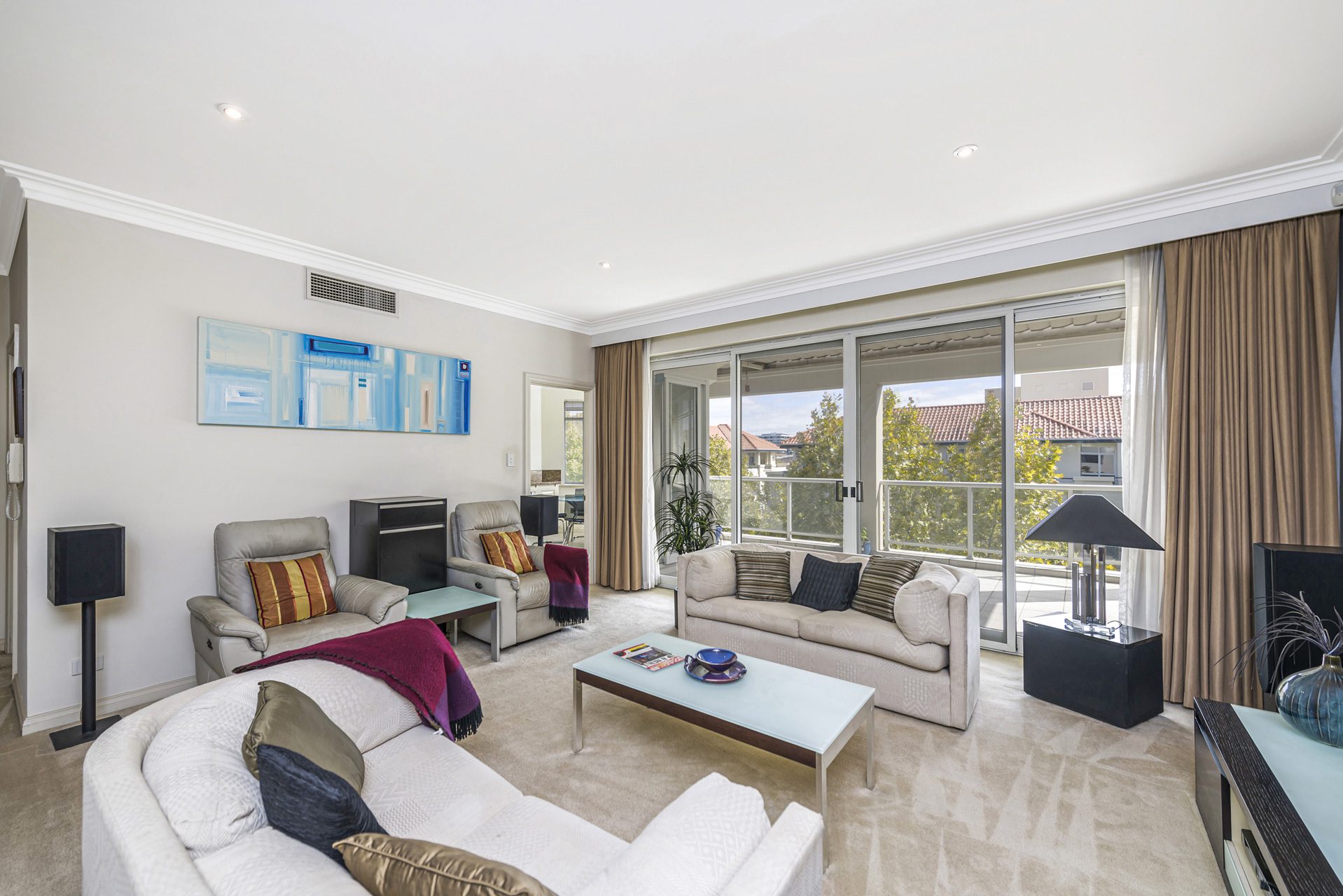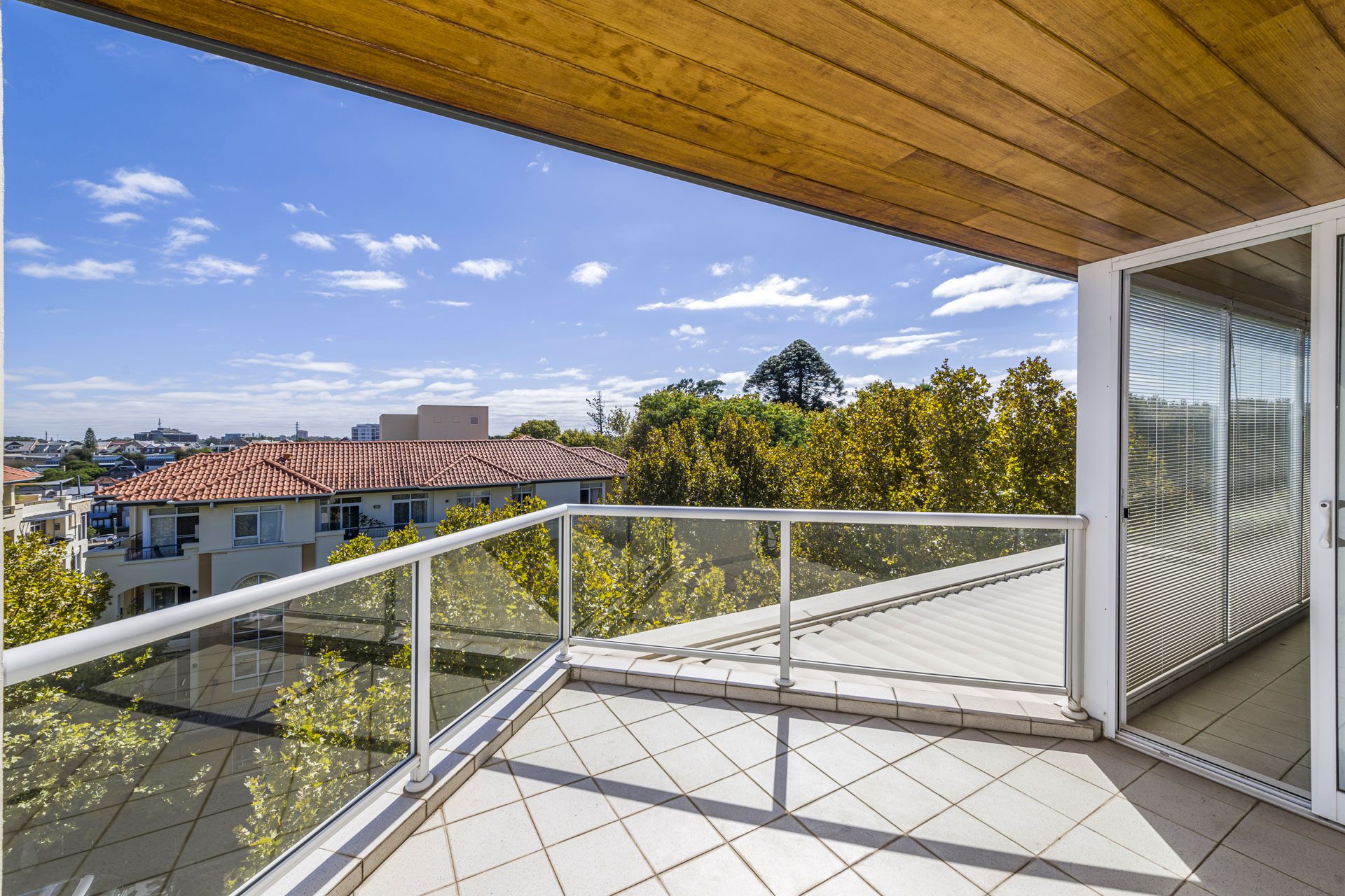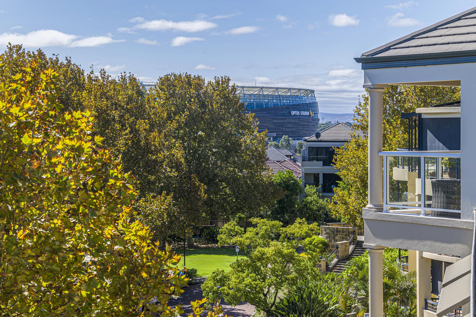 The spacious living area seamlessly connects to a huge balcony, complete with a louvered patio, creating the perfect indoor-outdoor lifestyle. From here, enjoy glimpses of Optus Stadium and the surrounding cityscape.