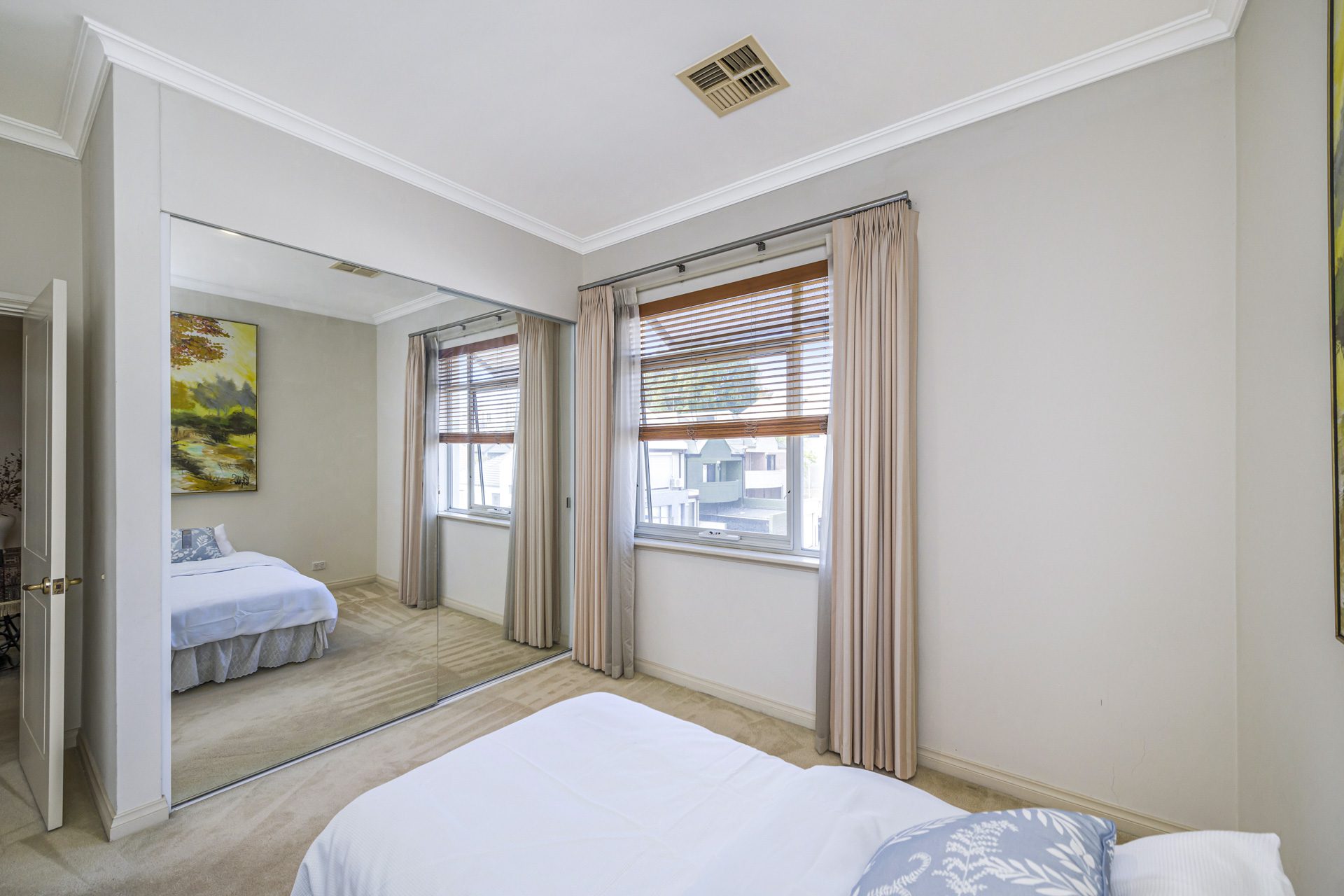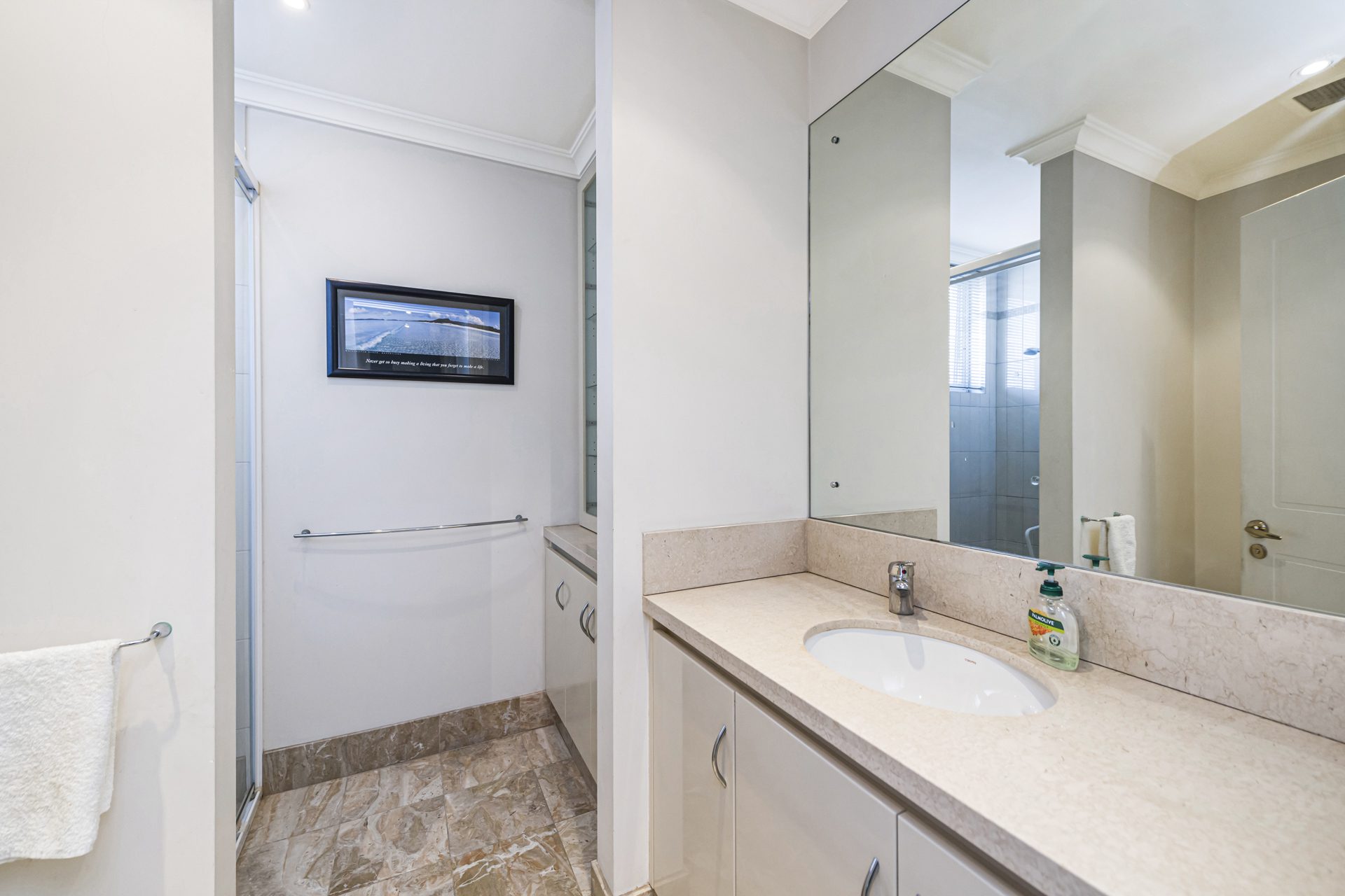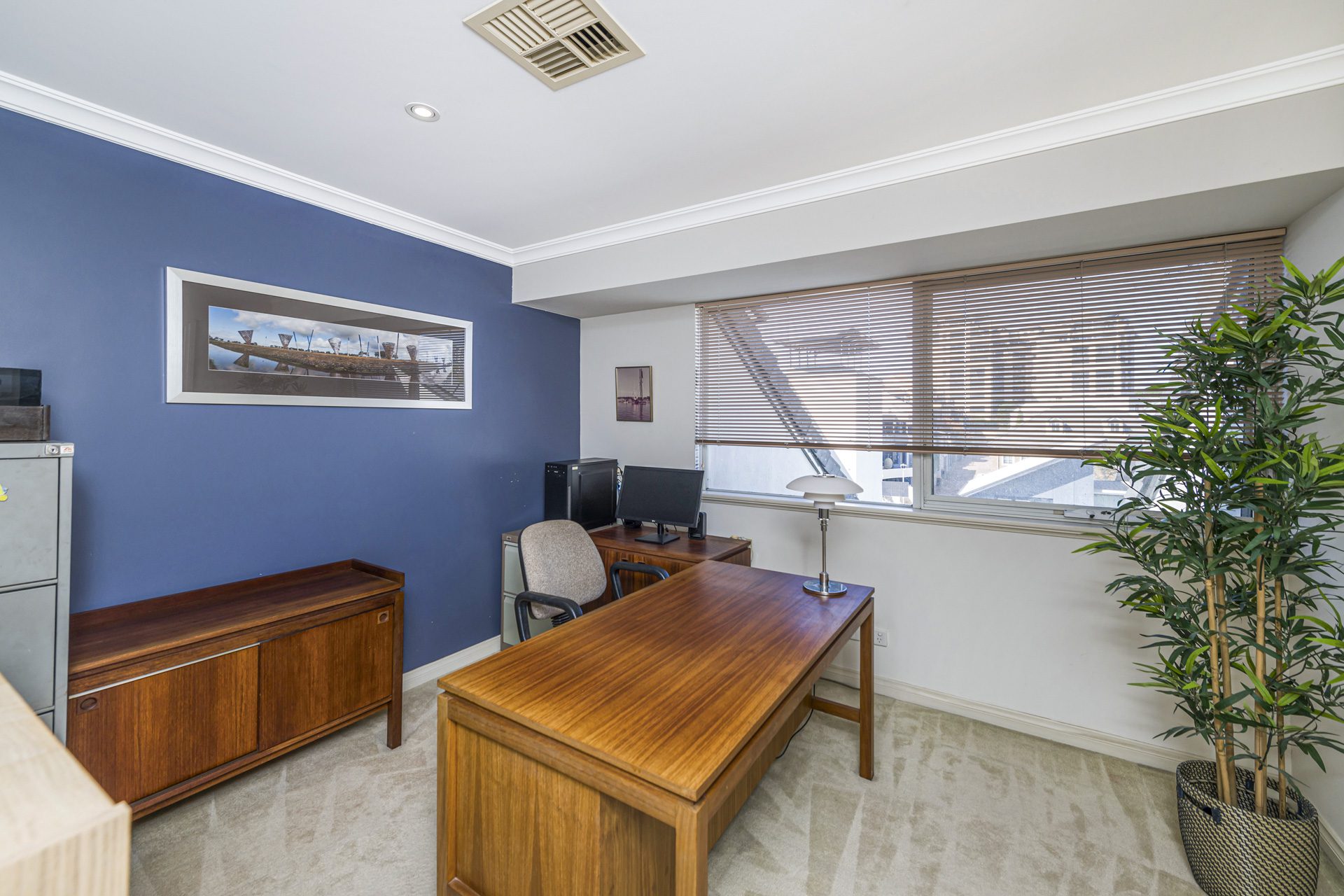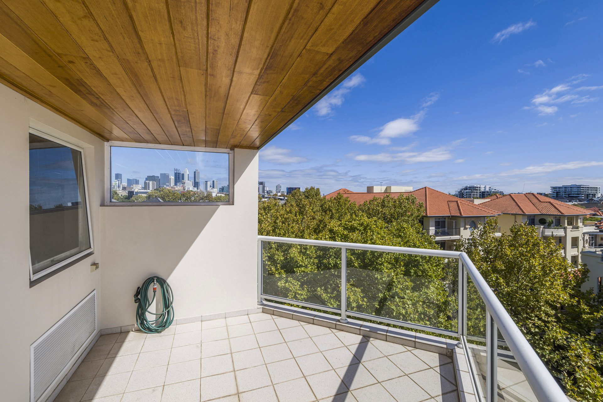 The spacious living area seamlessly connects to a huge balcony, complete with a louvered patio, creating the perfect indoor-outdoor lifestyle. From here, enjoy glimpses of Optus Stadium and the surrounding cityscape.