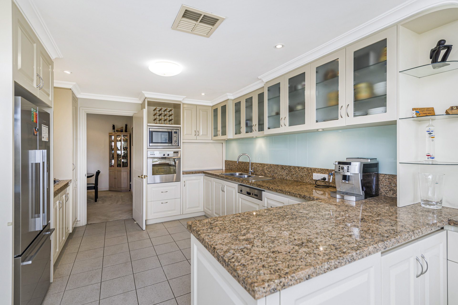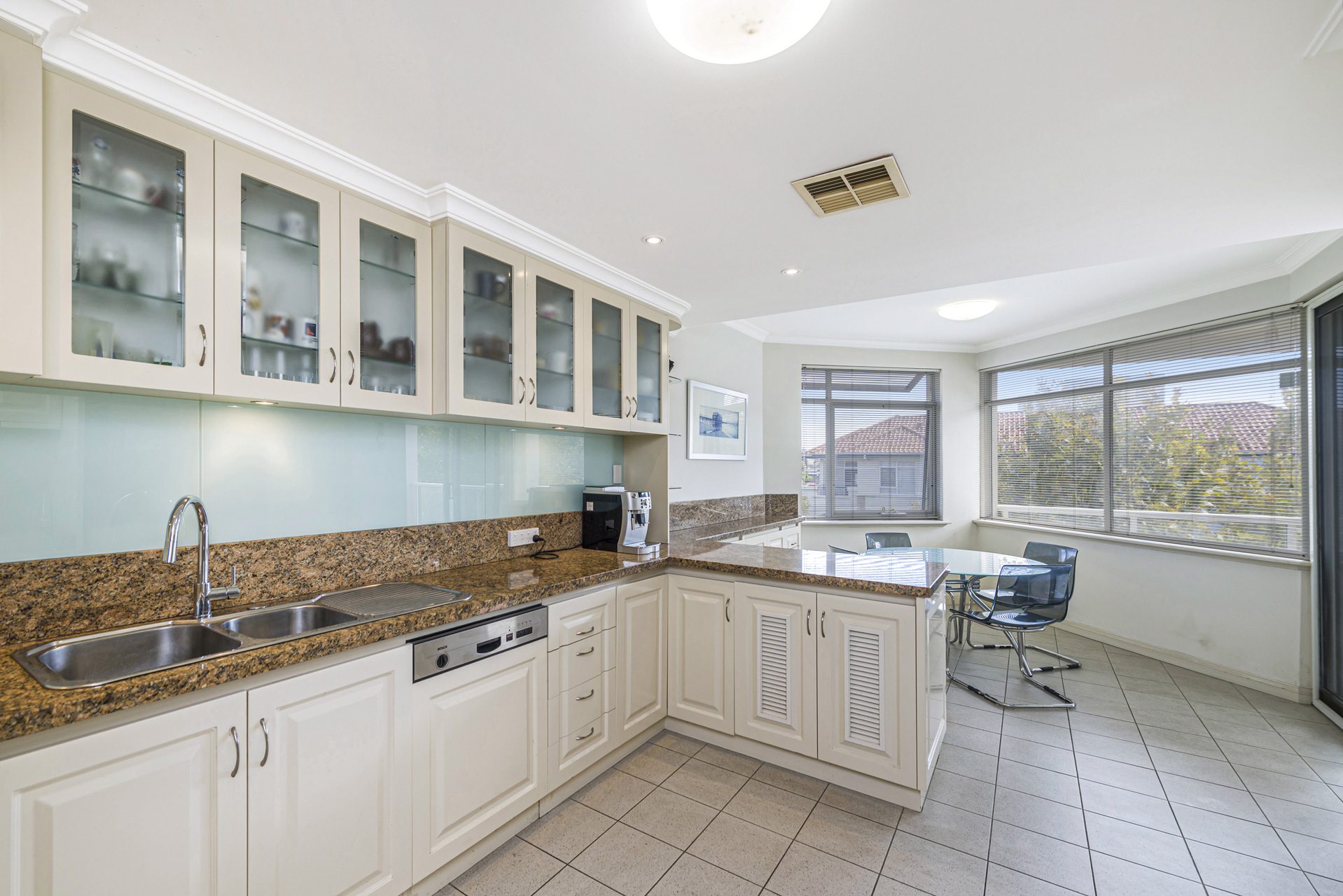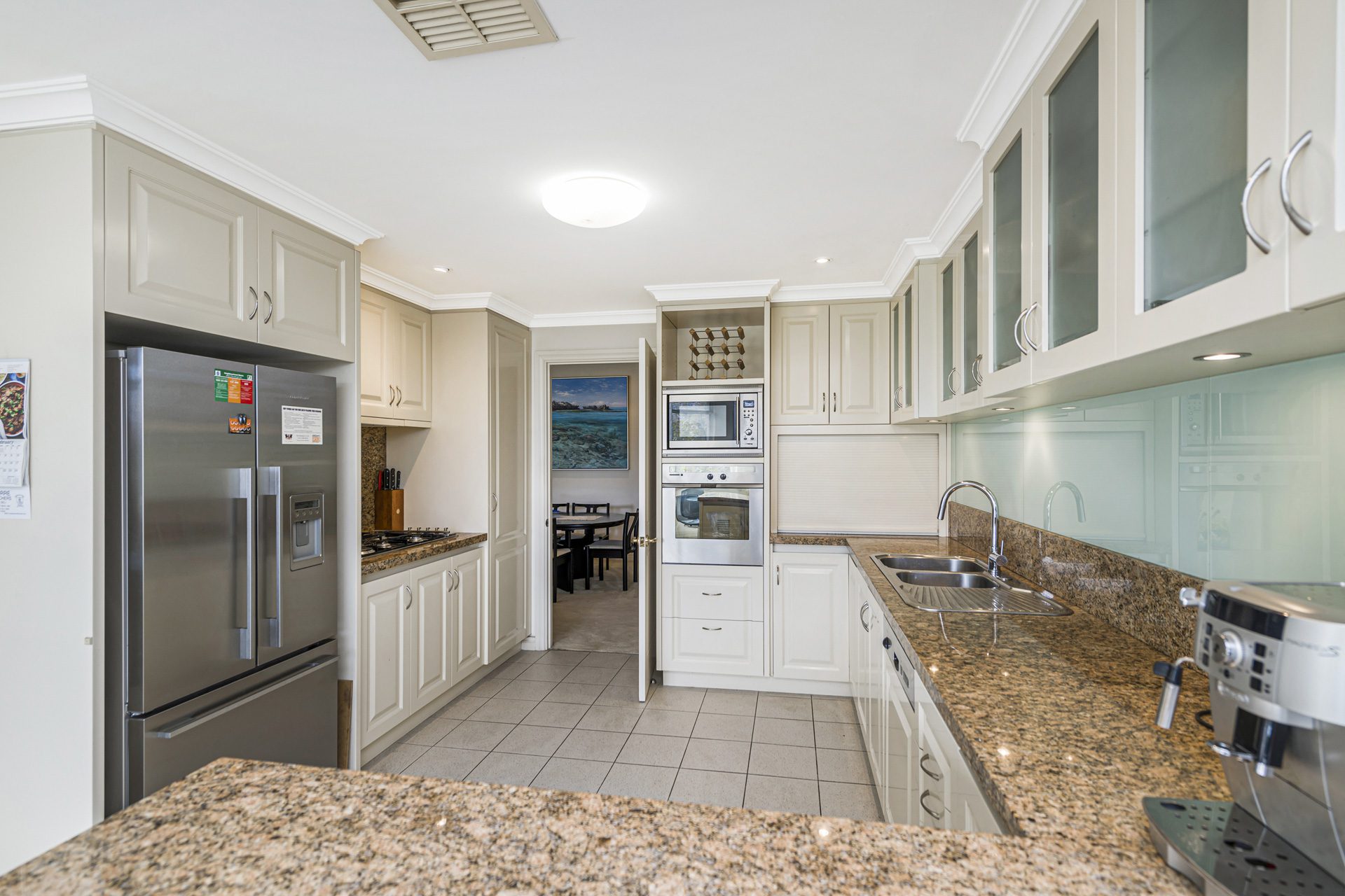 At the heart of the home, the well-appointed kitchen features granite benchtops, quality appliances including a Smeg gas cooktop, wall oven, integrated dishwasher, and a Smeg microwave. The adjoining informal dining area is enhanced by custom built-in cabinetry with a cleverly concealed bar fridge.