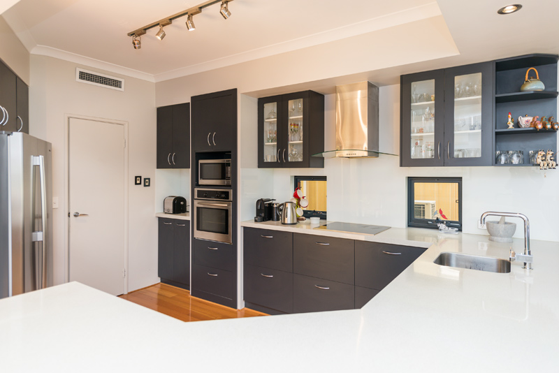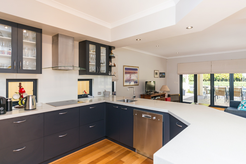 • Recessed ceiling to kitchen with feature lighting over benches – pot drawers, induction cooktop, large fridge recess, walk in pantry, Caesarstone benchtops, wall oven, dishwasher, stainless steel appliances, breakfast bar