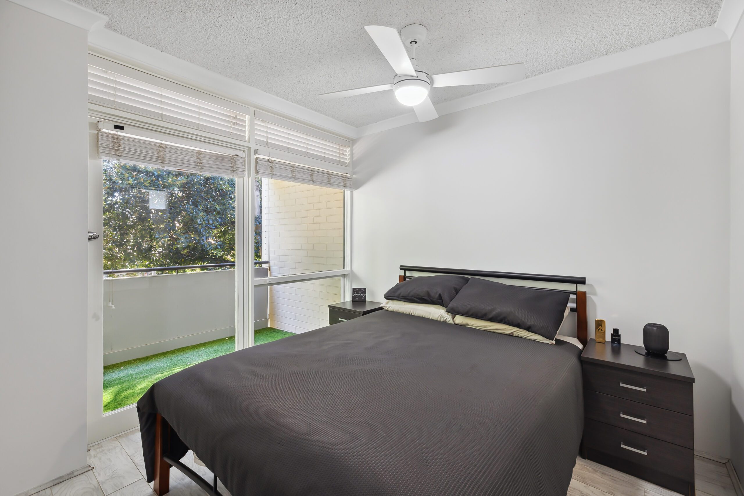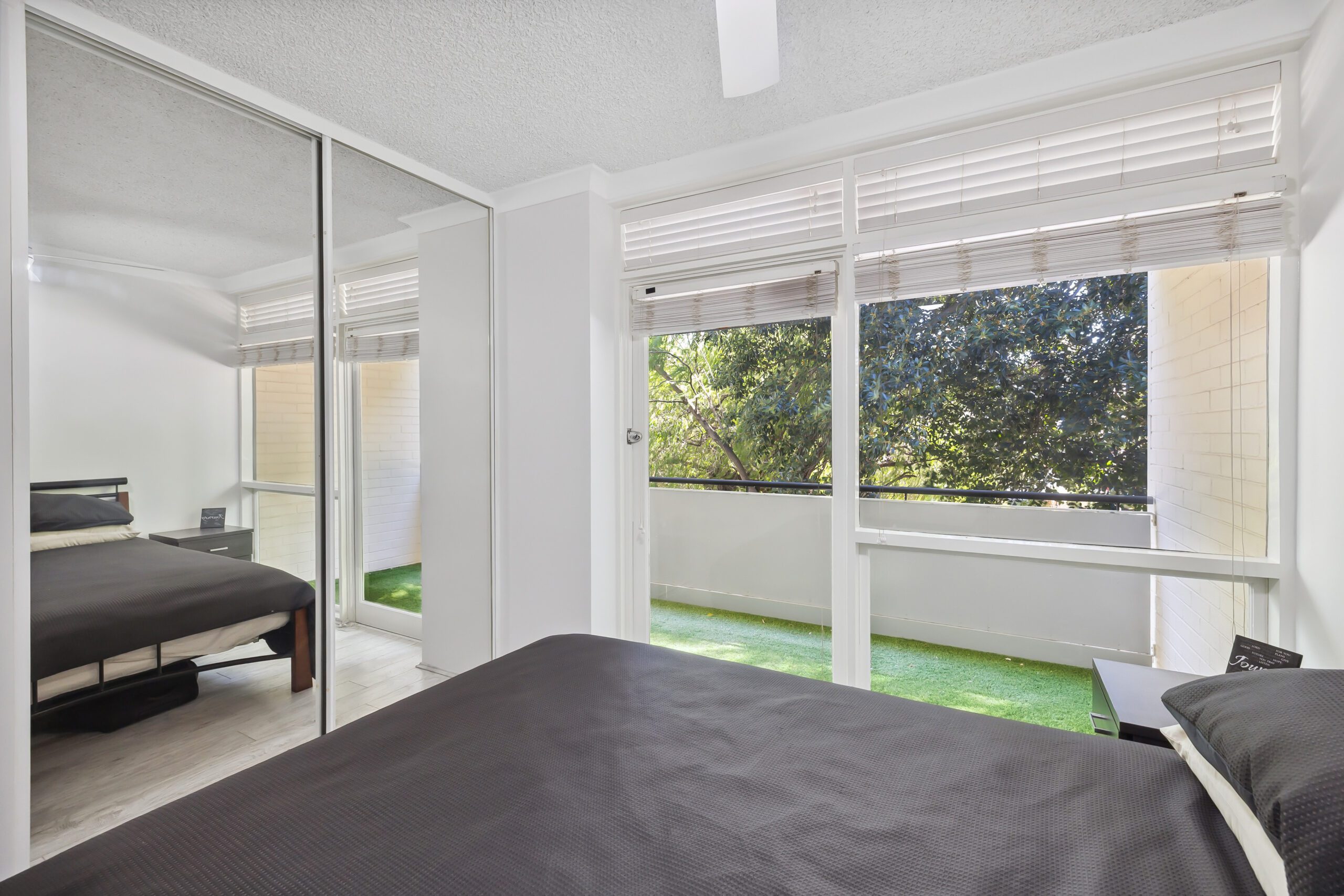 The bedroom is of a generous size with a mirrored built in robe and ceiling fan. The bathroom is close by with vanity, toilet and shower, as well as a laundry space.