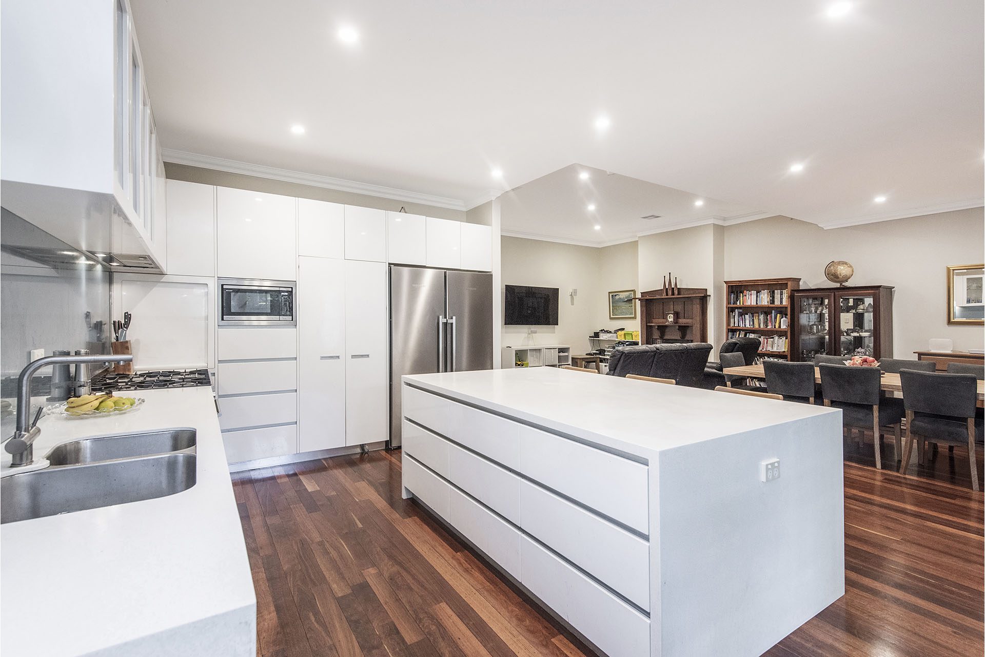 A perfect place for family gatherings, is the large modern gourmet kitchen which boasts premium appliances, filtered water tap, engineered surface bench-tops, a huge island bench with a bank of pull out drawers and a breakfast bar. There is loads of storage and bench space which caters to the needs of the modern chef. There is also a desk/study nook perfect for planning your next family gathering or helping the kids with their homework.